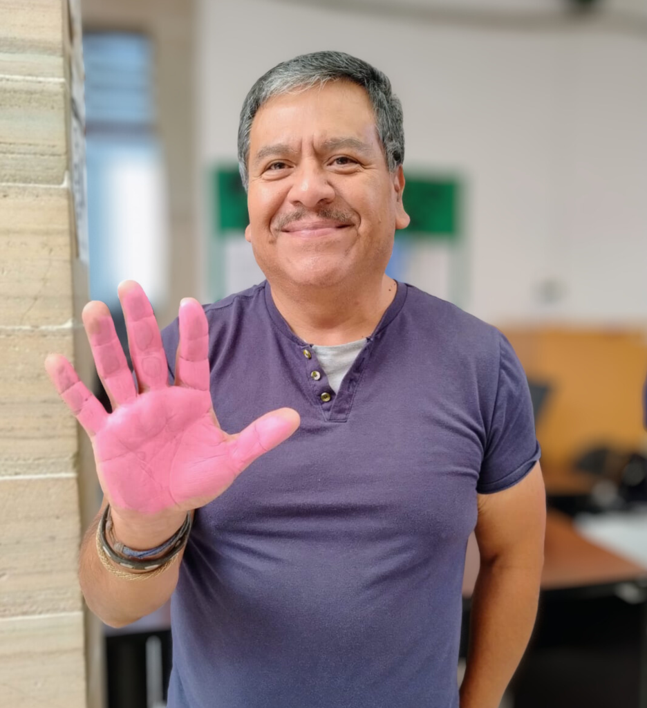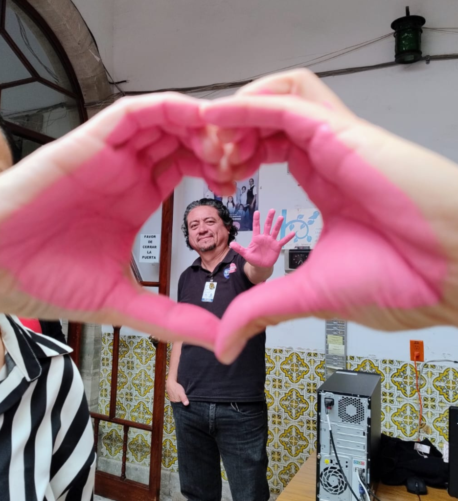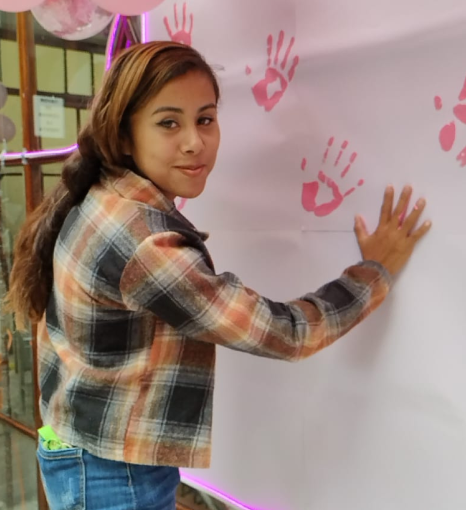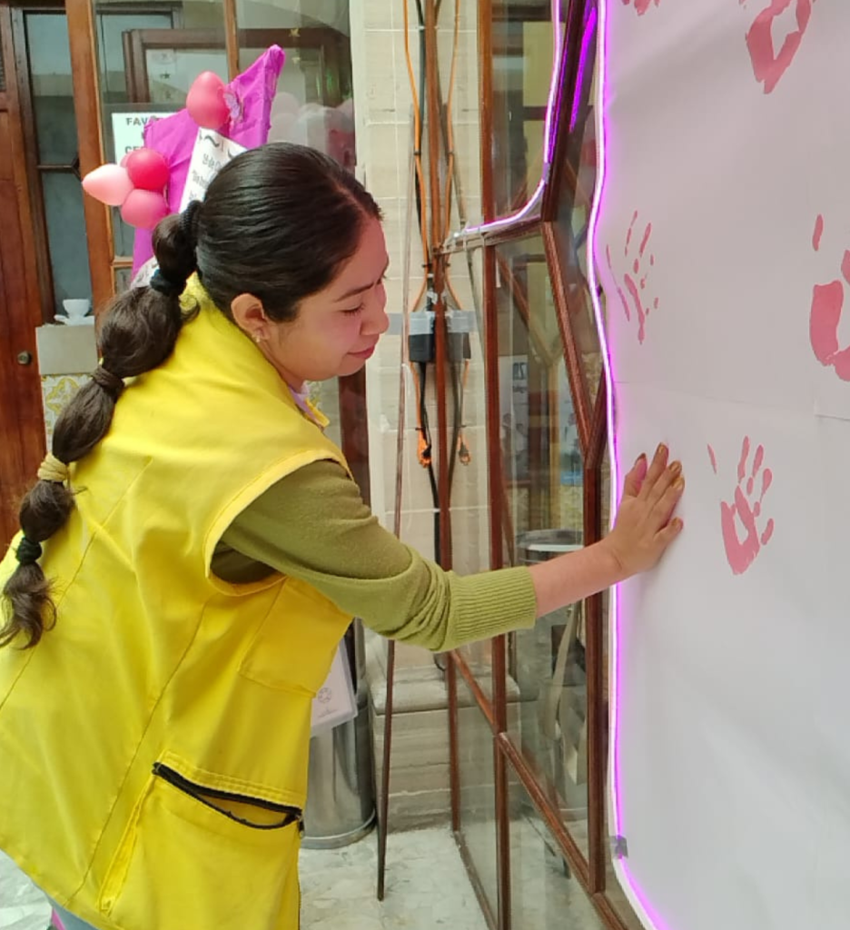 En este acto simbólico, tanto mujeres como hombres dejaron la huella de su mano en color rosa, manifestando su compromiso con la sensibilización, la prevención y la corresponsabilidad.