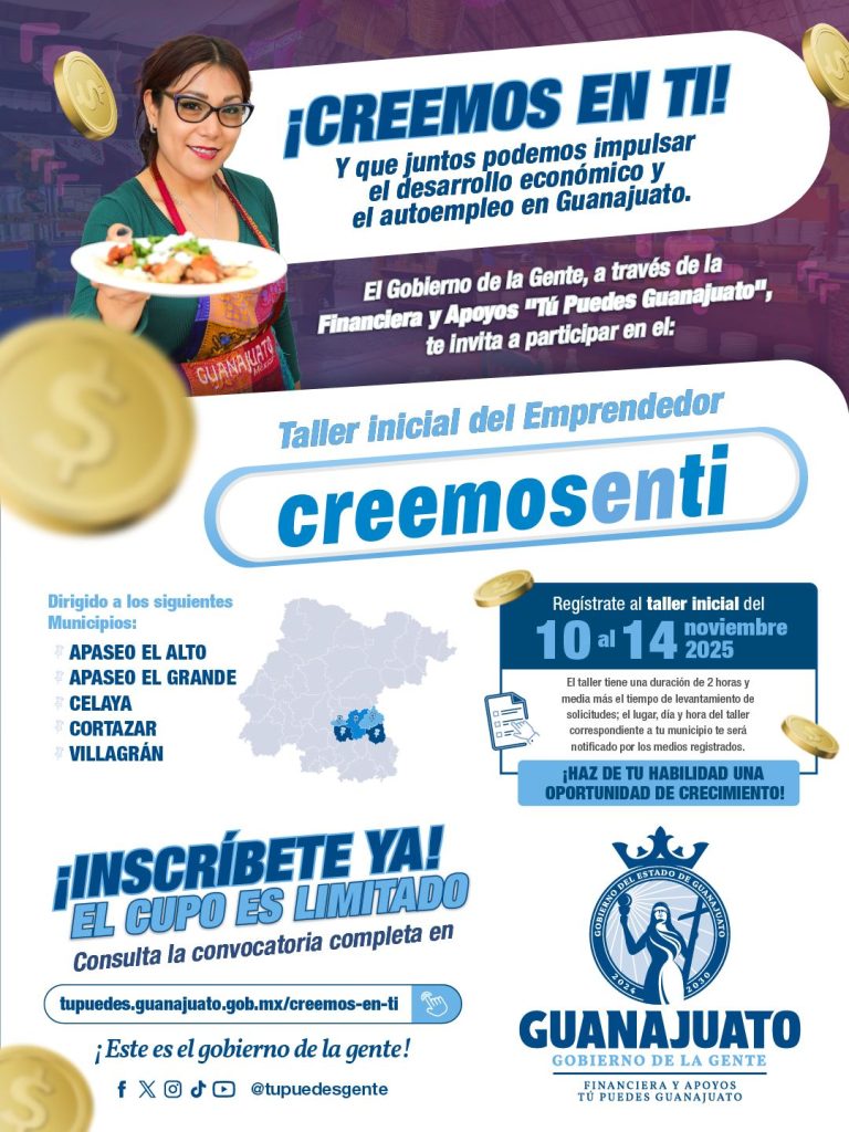 Silao, Guanajuato, a 10 de noviembre de 2025.- El gobierno de la Gente, en coordinación con la Financiera y Apoyos Tú Puedes Guanajuato, lanzó la convocatoria del programa “Creemos en ti” para cinco municipios de la zona Laja-Bajío.