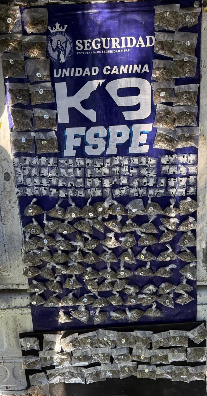 Al revisar el contenido, se localizaron un total de 1 mil 90 dosis de presuntas drogas: 80 envoltorios con una sustancia granulada con las características del cristal, equivalentes a 120 dosis, y 130 bolsitas con hierba verde y seca con las características de la marihuana, para 970 dosis.