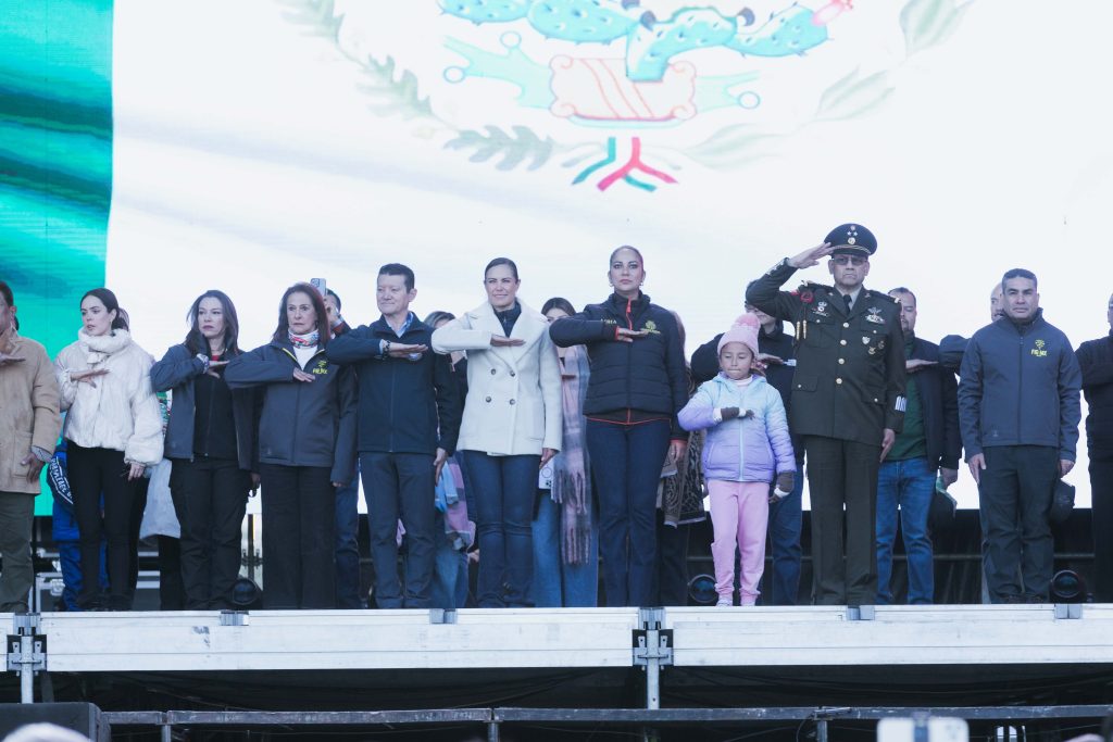 La jornada comenzó con el despliegue de la Bandera monumental por parte de elementos de la Secretaría de Defensa, acto seguido se realizaron los Honores al Lábaro Patrio, mientras que, en el cielo pasaban aviones de la Fuerza Aérea Mexicana.