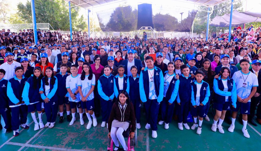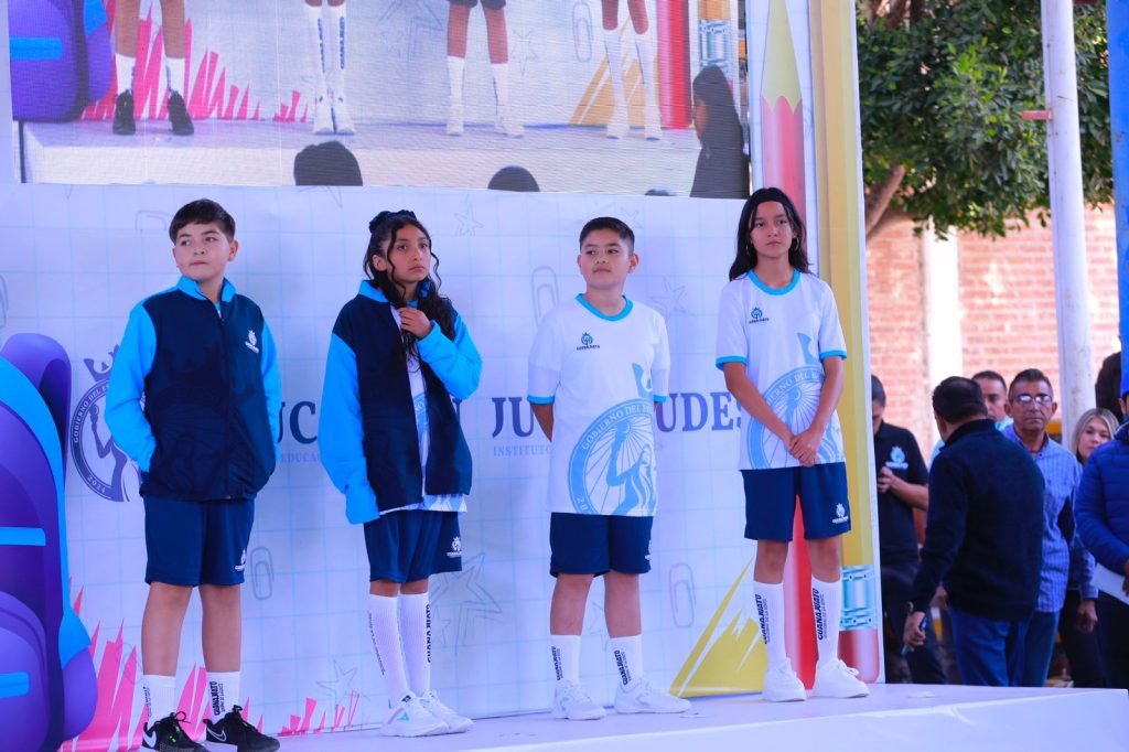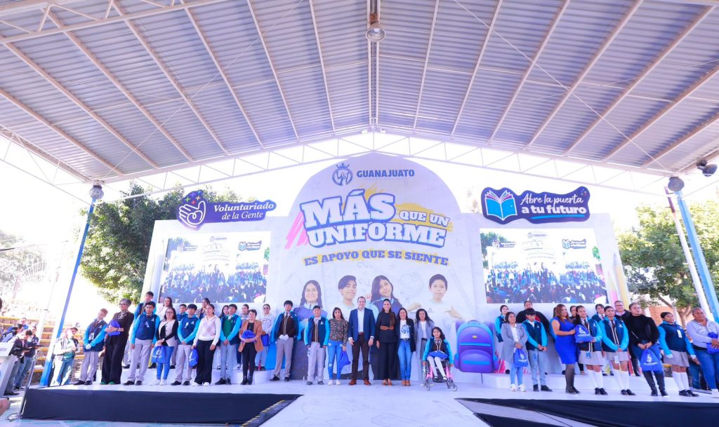El Programa de Uniformes Escolares 2025–2026 beneficia a 279 mil 726 alumnas y alumnos de secundarias públicas de los 46 municipios, quienes hoy de manera simbólica en Dolores Hidalgo, recibieron de manos de Libia Dennise, el uniforme deportivo completo compuesto por 6 piezas: chamarra, playera, pants, short, gorra y calcetas.
