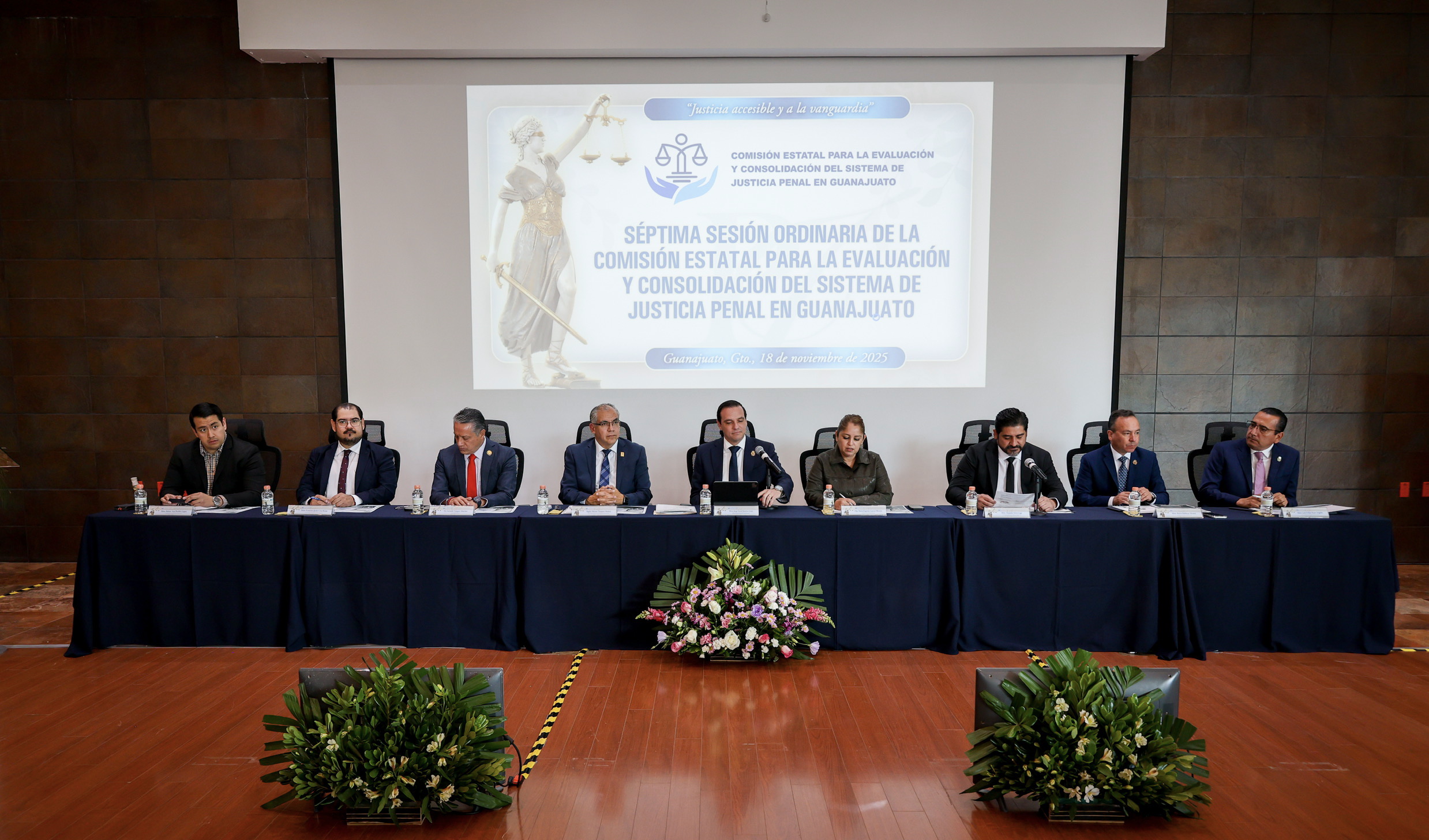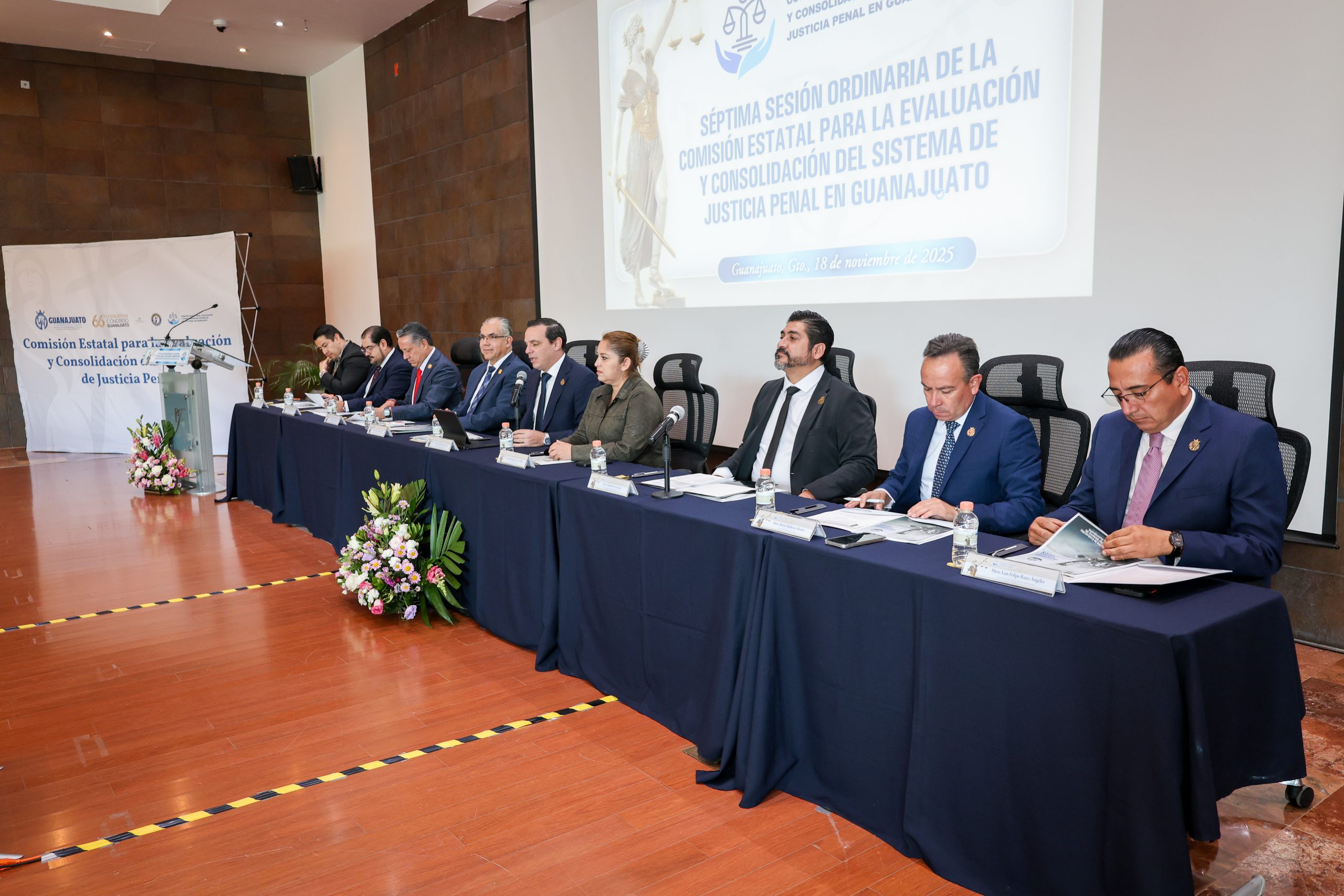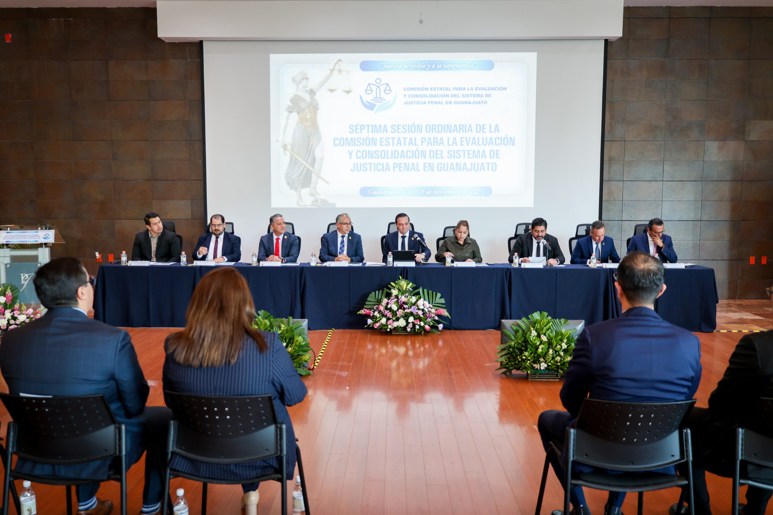 Guanajuato, Guanajuato a 18 de noviembre de 2025. La Comisión Estatal para la Evaluación y Consolidación del Sistema de Justicia Penal en Guanajuato llevó a cabo la Séptima Sesión Ordinaria, en donde asistieron los miembros de la Comisión Estatal: