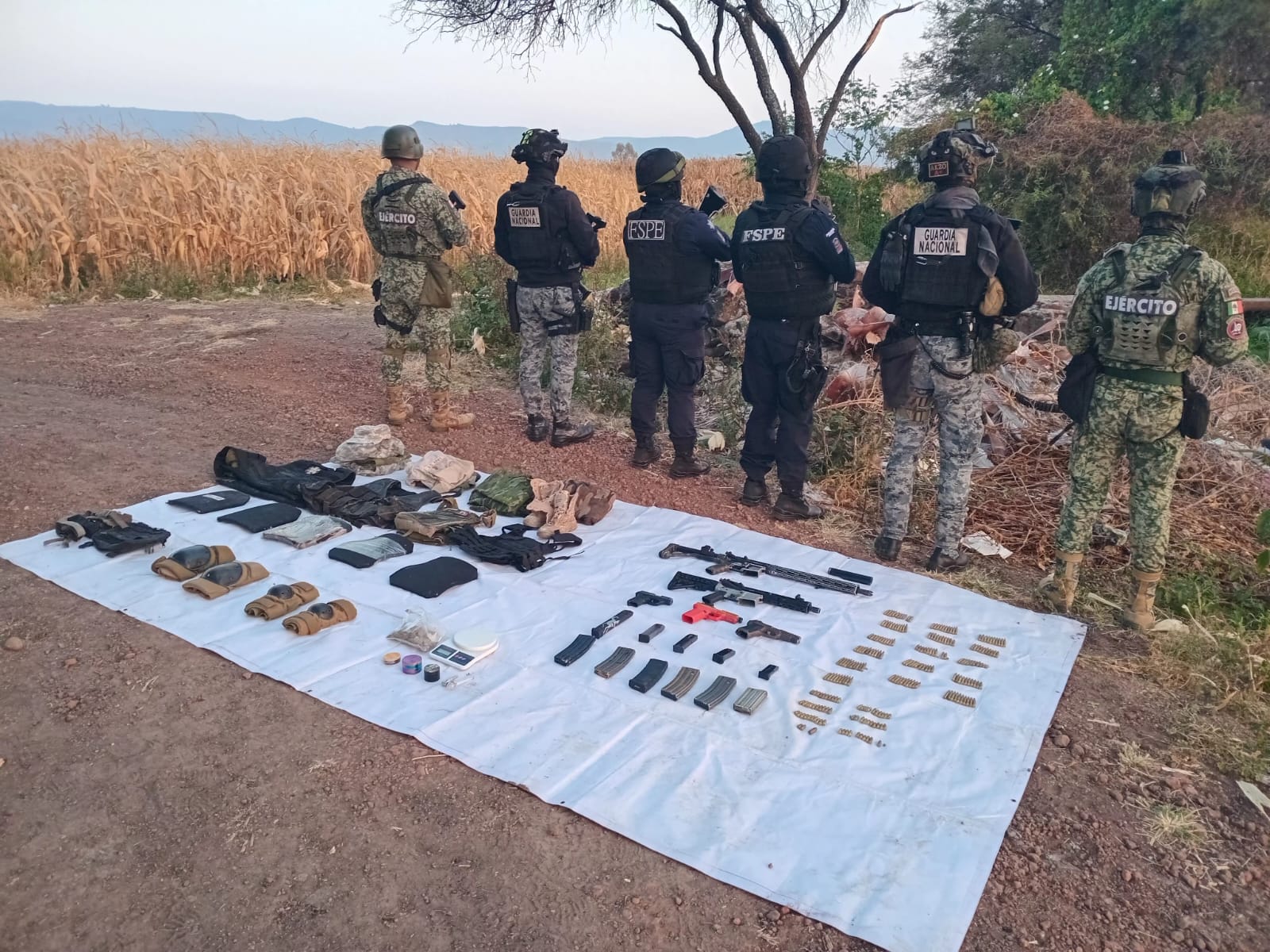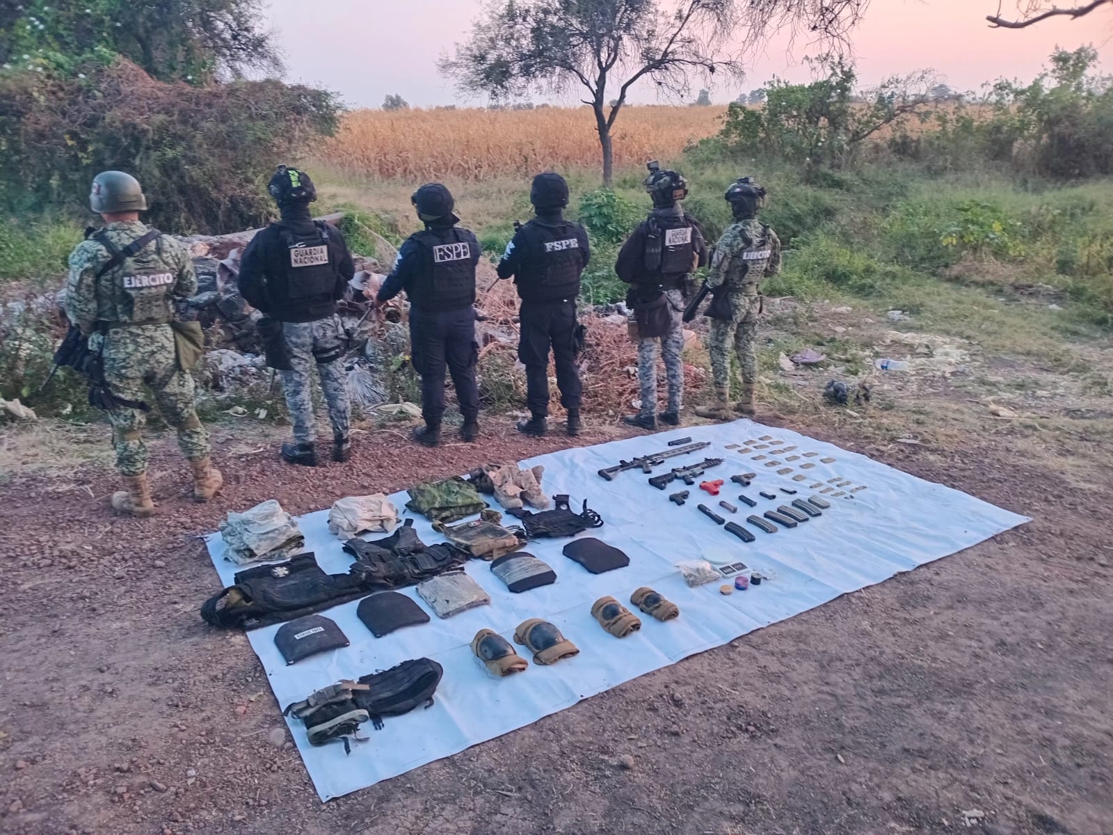Guanajuato, Gto., a 26 de noviembre de 2025.- En un operativo conjunto entre las Fuerzas de Seguridad Pública del Estado (FSPE) adscritas a la Secretaría de Seguridad y Paz, la Secretaría de la Defensa Nacional (DEFENSA) y la Guardia Nacional (GN) aseguraron armamento, equipo táctico y droga en la comunidad de Churipitzeo, en el municipio de Pénjamo.