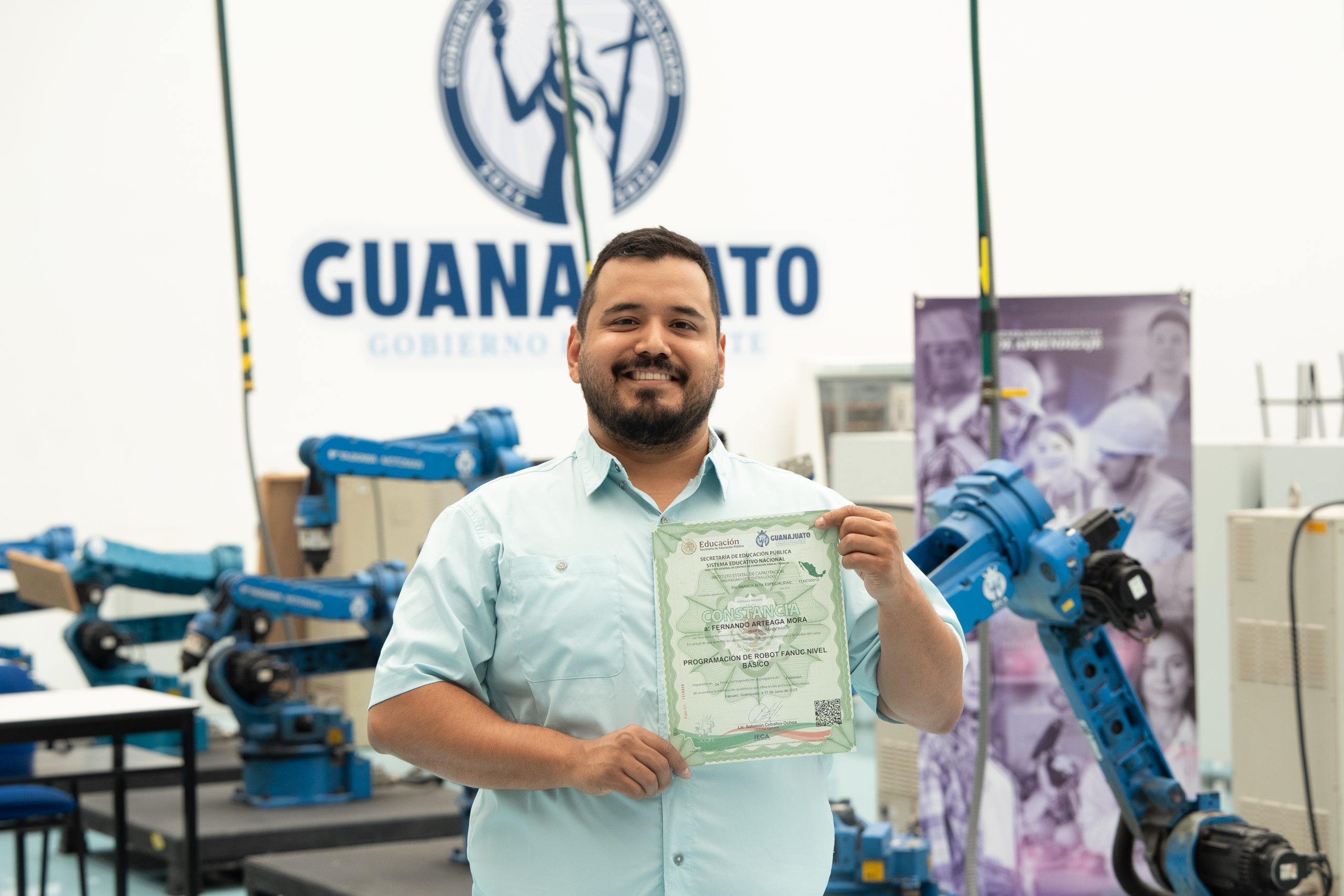 León, Guanajuato a 04 de diciembre de 2025. La historia de Fernando Arteaga, ingeniero automotriz con especialidad en manufactura, es un ejemplo del impacto que la capacitación técnica y la constancia pueden tener en la vida profesional de las y los guanajuatenses. Gracias a la formación recibida en el Instituto Estatal de Capacitación (IECA), Fernando ha logrado certificarse oficialmente como especialista en robótica, abriendo nuevas oportunidades en el sector automotriz.