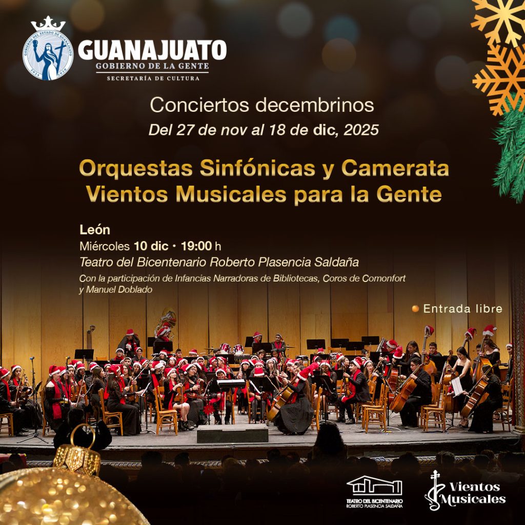 León, Guanajuato, 9 de diciembre de 2025. La Secretaría de Cultura del Estado de Guanajuato anuncia el concierto Una Navidad de Cuento, a cargo de la Orquesta Sinfónica Vientos Musicales León, que tendrá lugar el miércoles 10 de diciembre a las 19:00 horas en la Sala Principal del Teatro del Bicentenario Roberto Plasencia Saldaña. Este concierto especial celebra el espíritu de la temporada y marca un momento significativo para la agrupación, que este año conmemora su décimo aniversario de actividad musical formativa en la ciudad de León.
