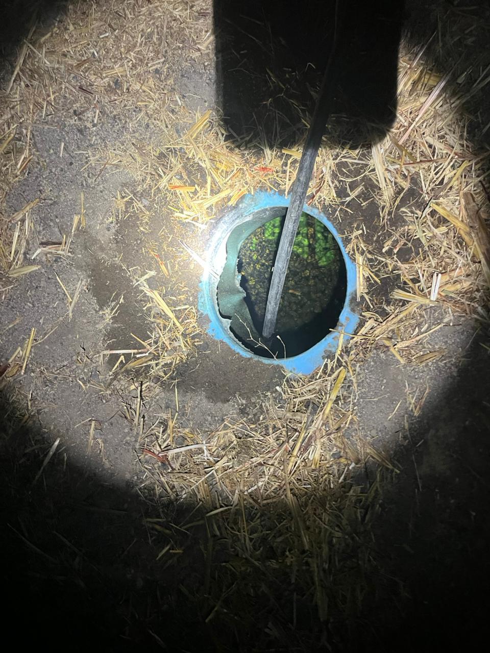 Durante el recorrido, el personal operativo localizó un tractocamión tipo torton con un contenedor metálico vacío, así como un inmueble tipo bodega, en cuyo interior se encontraron dos cisternas de plástico enterradas, abastecidas con hidrocarburo de procedencia presuntamente ilegal, lo que representaba un riesgo para la población.