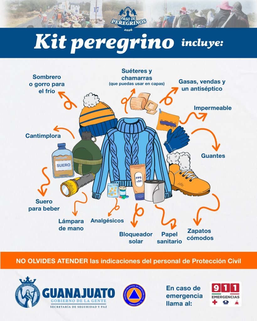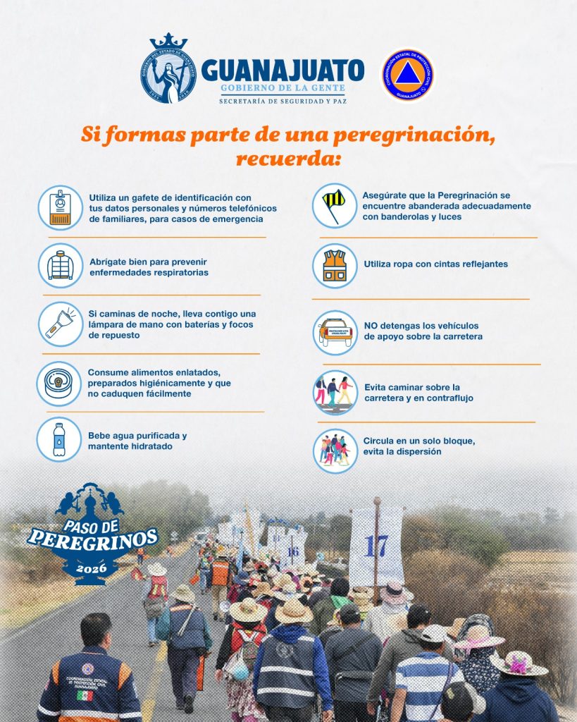 Guanajuato, Gto., a 15 de enero de 2026.- A partir de este 16 de enero, las peregrinaciones desde distintos puntos del país comenzarán su recorrido hasta San Juan de Los Lagos, Jalisco; incrementando paulatinamente con el paso de los días. Se prevé que más de 300 mil peregrinos atraviesen 33 municipios de la entidad, considerando la afluencia del 2025.