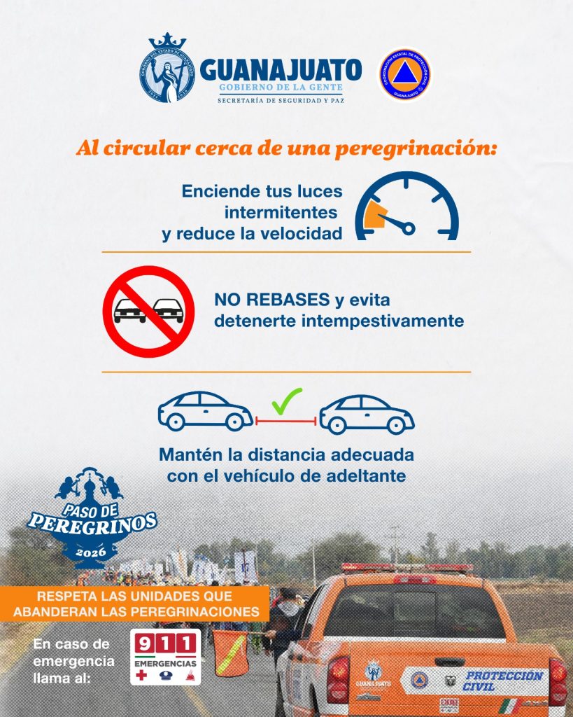 Ante el paso de personas peregrinas por la entidad, la Coordinación Estatal de Protección Civil de Guanajuato hace un llamado a todos los automovilistas a seguir las recomendaciones para reducir posibles riesgos.