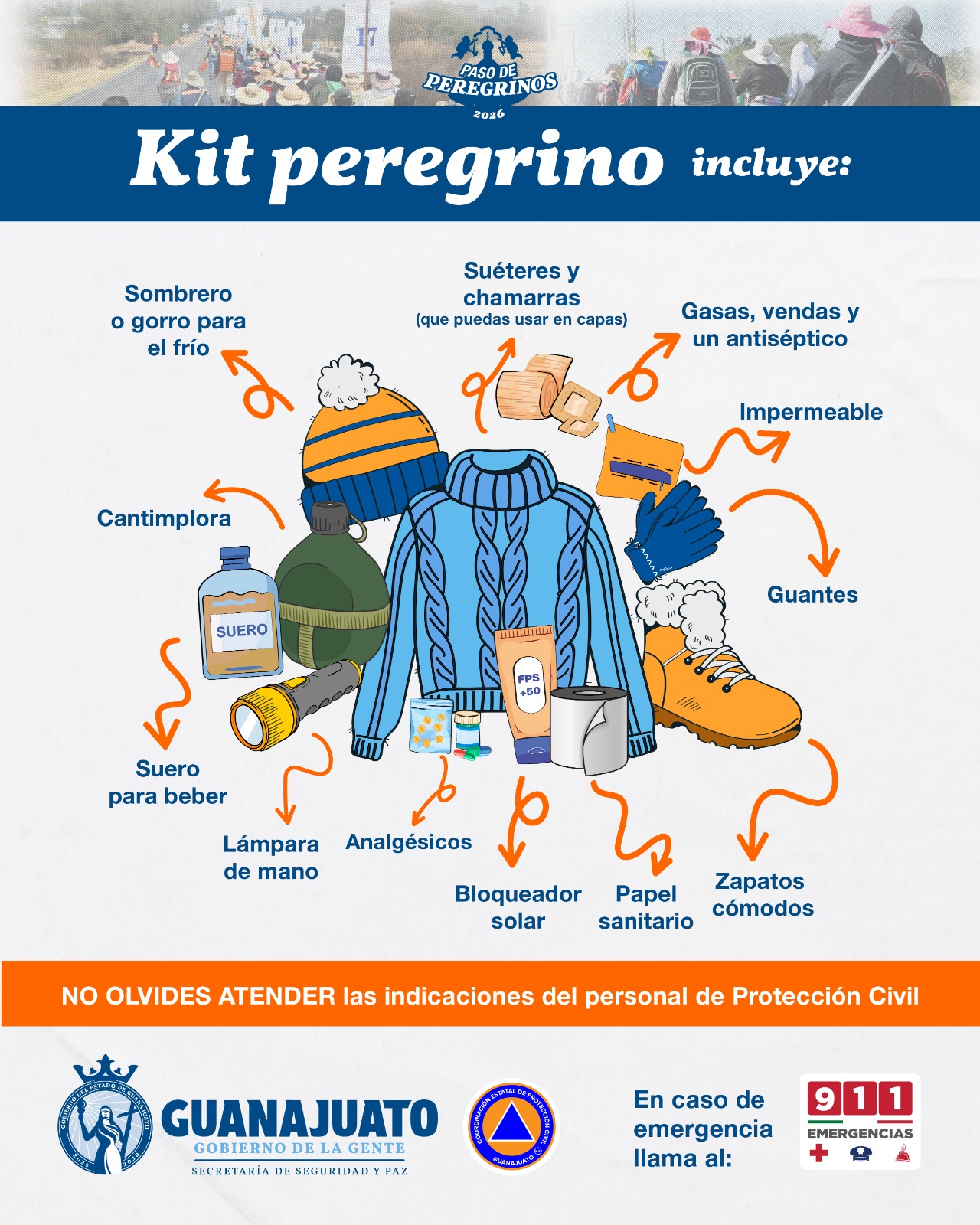 Al cuidado de todas las personas peregrinas estarán: la Secretaría de Seguridad y Paz, a través de la Coordinación Estatal de Protección Civil, las Fuerzas de Seguridad Pública del Estado, la Policía Estatal de Caminos y el Sistema Estatal C5i; la Secretaría de Salud; Sistema de Urgencias del Estado de Guanajuato; Asociación de Bomberos del Estado de Guanajuato; Delegación Estatal de Cruz Roja y sus delegaciones municipales; Caminos y Puentes Federales (Capufe); Ángeles Verdes; y las Coordinaciones Municipales de Protección Civil y Seguridad Pública.