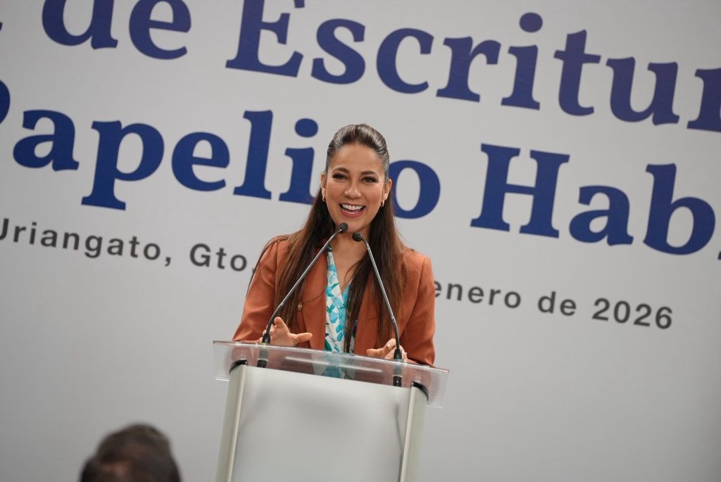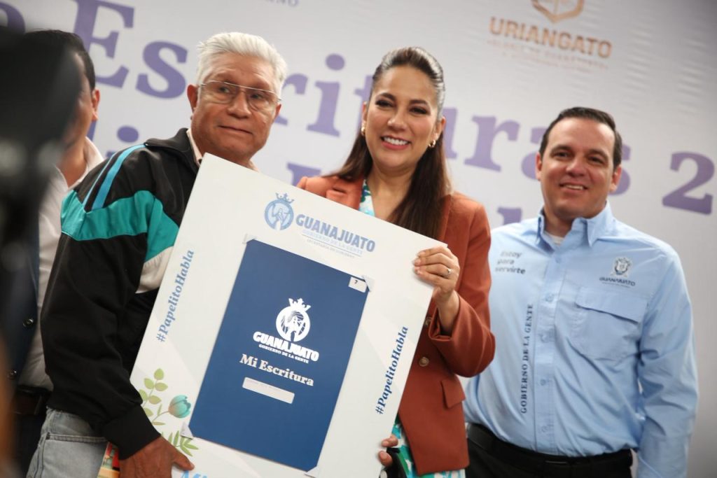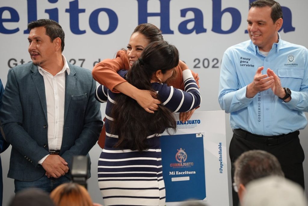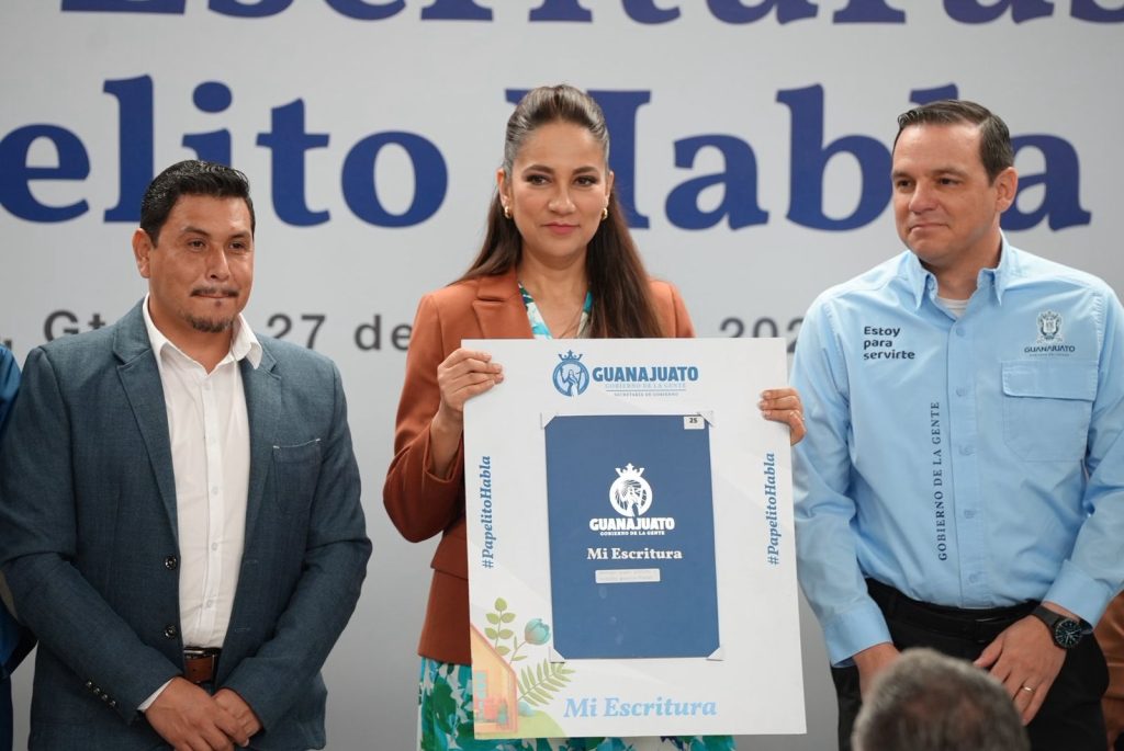 Libia Dennise dijo que “es un gusto estar aquí, entregando las escrituras del programa Papelito Habla; este documento, representa el fruto de todo su esfuerzo. Se está cambiando la vida de familias que a partir de ahora ya tienen certeza sobre su patrimonio”.
