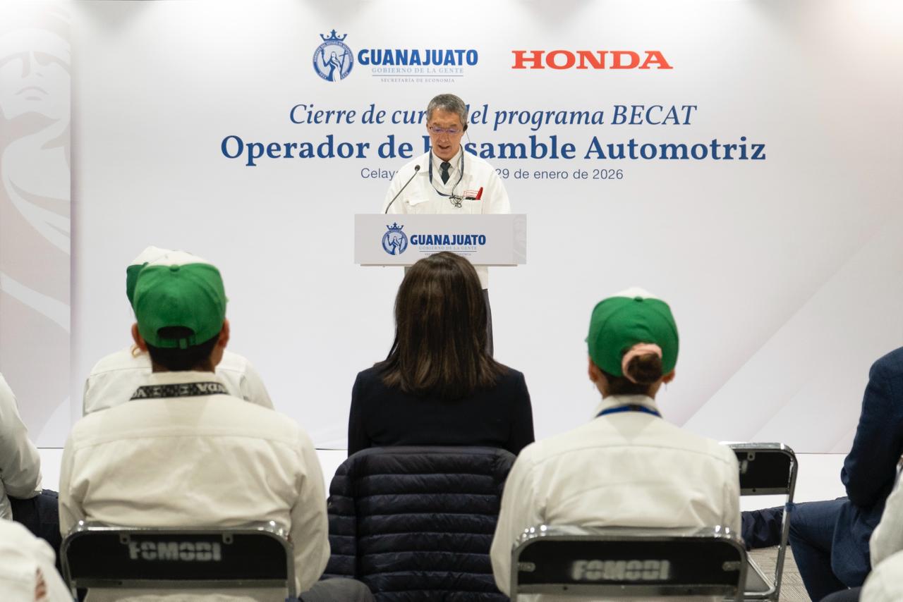 Celaya, Gto.- 29 de enero del 2026.- El Gobierno de la Gente y la armadora Honda llevaron a cabo la ceremonia de clausura del Programa de Capacitación para el Trabajo BécaT, en la modalidad “Operador de Ensamble Automotriz”.