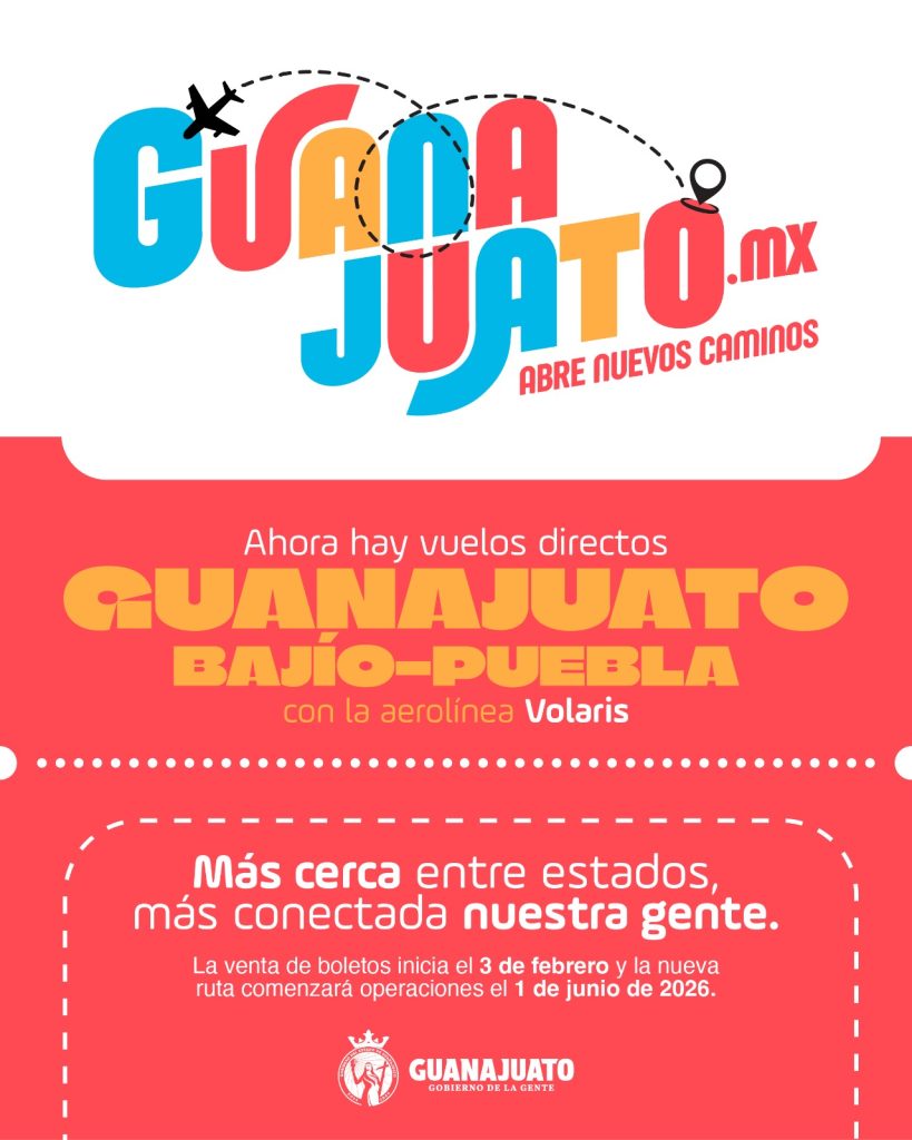 León, Guanajuato a 3 de febrero de 2026.– El Aeropuerto Internacional de El Bajío contará con una nueva ruta aérea que conectará directamente a Guanajuato con la ciudad de Puebla, operada por Volaris, fortaleciendo la conectividad entre dos de las zonas económicas más relevantes del país y ampliando las oportunidades de desarrollo turístico, comercial y de negocios.