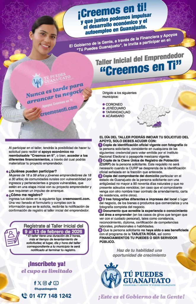 Silao, Guanajuato, a 09 de febrero de 2026. Con el objetivo de continuar con el fortalecimiento de la economía en las comunidades más alejadas y fomentar el autoempleo, el gobierno del Estado, a través de la Financiera y Apoyos “Tú Puedes Guanajuato”, anunció el lanzamiento de la segunda convocatoria 2026 del programa “Creemos en ti”.