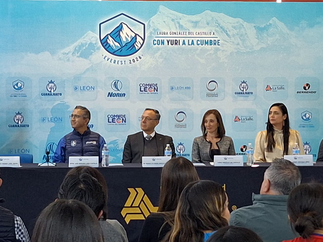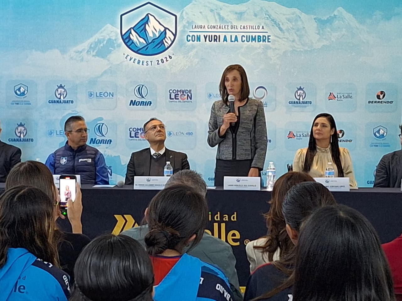 La alpinista estuvo acompañada de la Directora General de CODE, Yendy Cortinas López quien ofreció el respaldo a esta expedición; además del Rector de La Salle, Enrique González Álvarez y alumnos reunidos para conocer la historia de valor y riesgo que significa el ascenso al Everest.