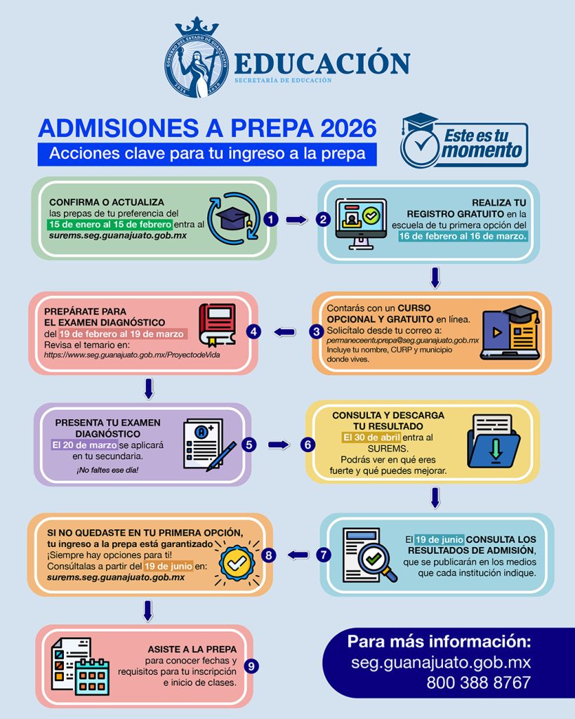 Guanajuato, Gto., 09 de febrero de 2026.– En Guanajuato, continuar los estudios de bachillerato sí es posible. La Secretaría de Educación de Guanajuato (SEG) informa que ya se encuentra disponible el proceso de Ingreso a Educación Media Superior para el ciclo escolar 2026–2027, dirigido a todas las personas que deseen continuar su preparación, incluso quienes egresaron de secundaria en años anteriores o realizaron sus estudios en otros sistemas educativos.