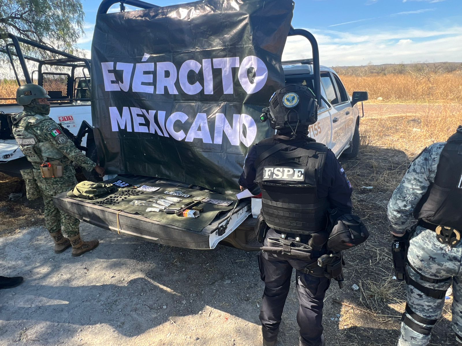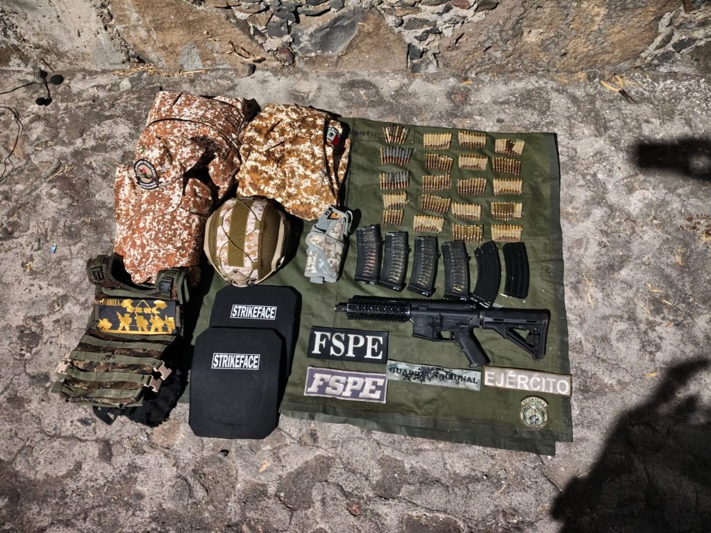 Tras la inspección se logró asegurar los vehículos, ambos con reporte de robo vigente, un arma larga, 194 cartuchos útiles, seis cargadores, tres chamarras tácticas con patrón pixelado, un casco balístico, un chaleco balístico y una funda para arma corta.