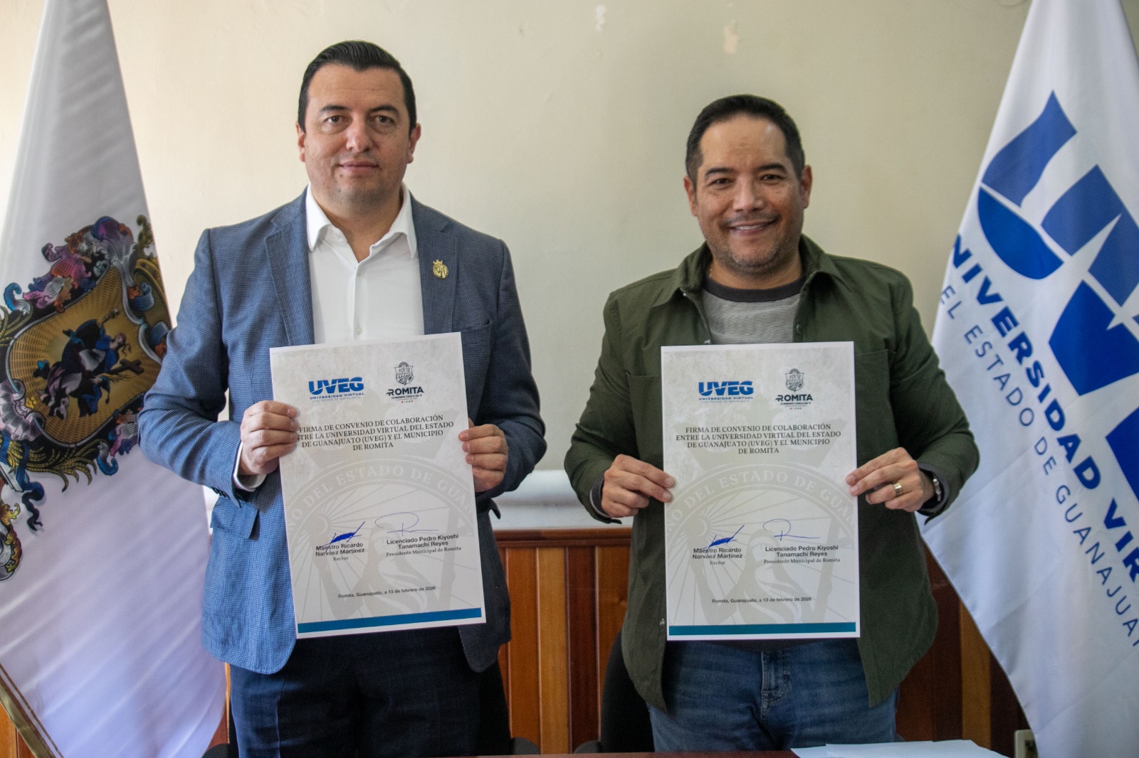 Romita, Guanajuato, 13 de febrero. Con el objetivo de ampliar las oportunidades educativas en el municipio, la Universidad Virtual del Estado de Guanajuato (UVEG) y el Municipio de Romita firmaron un Convenio de Colaboración que pone énfasis en becas, atención prioritaria a mujeres y apoyos académicos para integrantes de seguridad pública y sus familias.