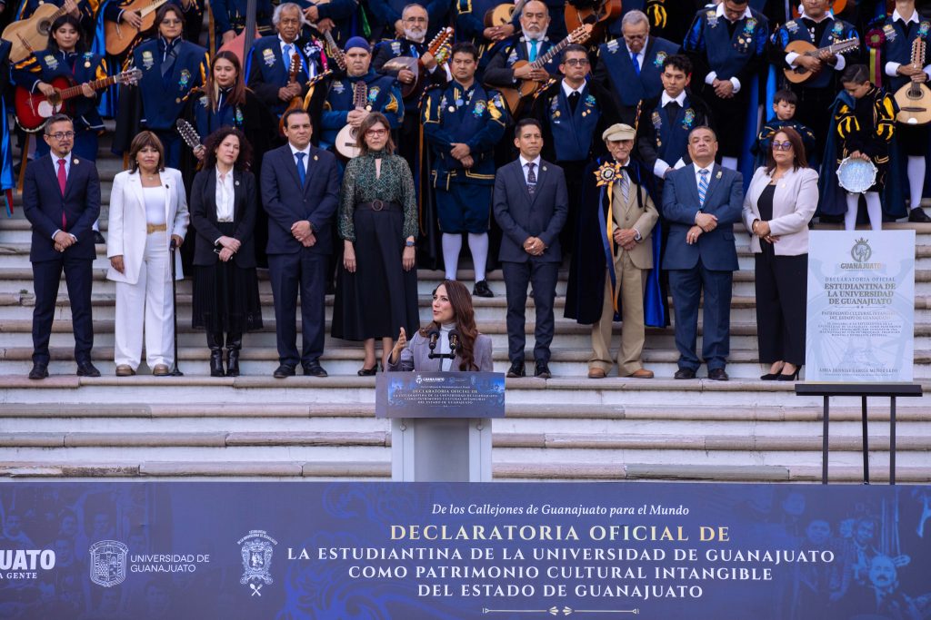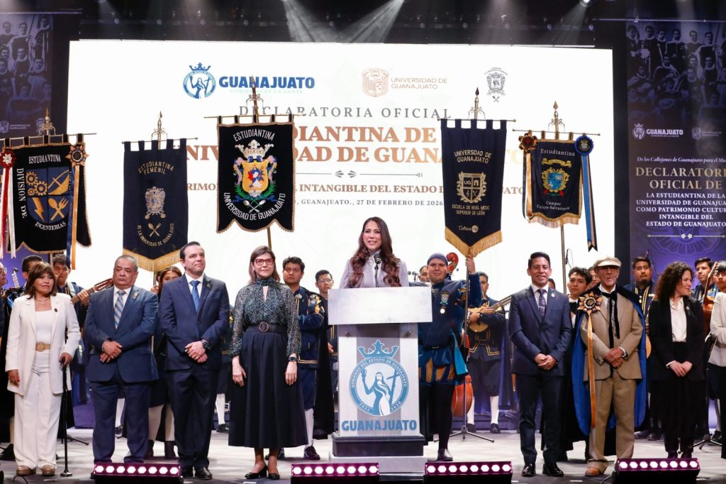 Guanajuato, Gto. 27 de febrero de 2026.– “Cada rincón de Guanajuato evoca cosas maravillosas y no se podría entender la historia de una ciudad como ésta, de una capital como la nuestra, sin la Estudiantina de la Universidad de Guanajuato”, expresó la Gobernadora de la Gente, Libia Dennise García Muñoz Ledo, en la ceremonia de Declaración de Estudiantina de la Universidad de Guanajuato como Patrimonio Cultural Intangible del Estado de Guanajuato.