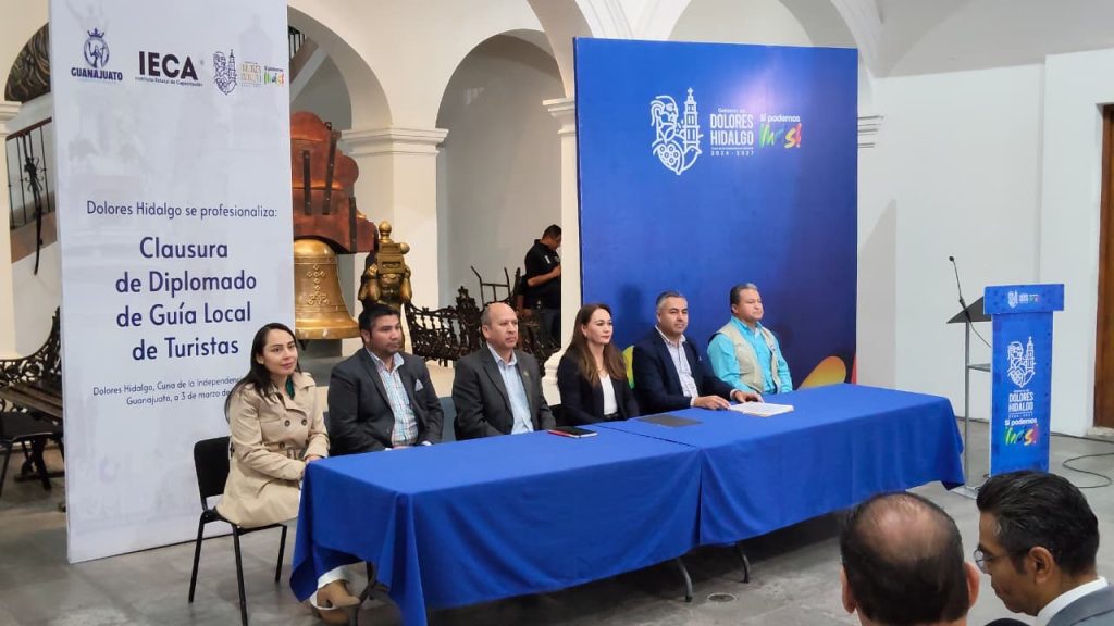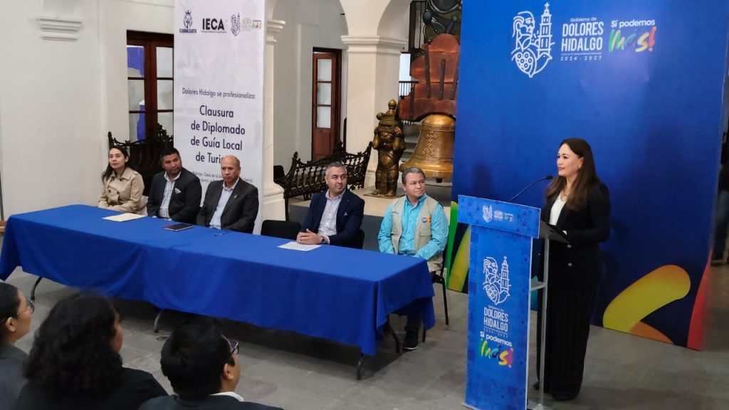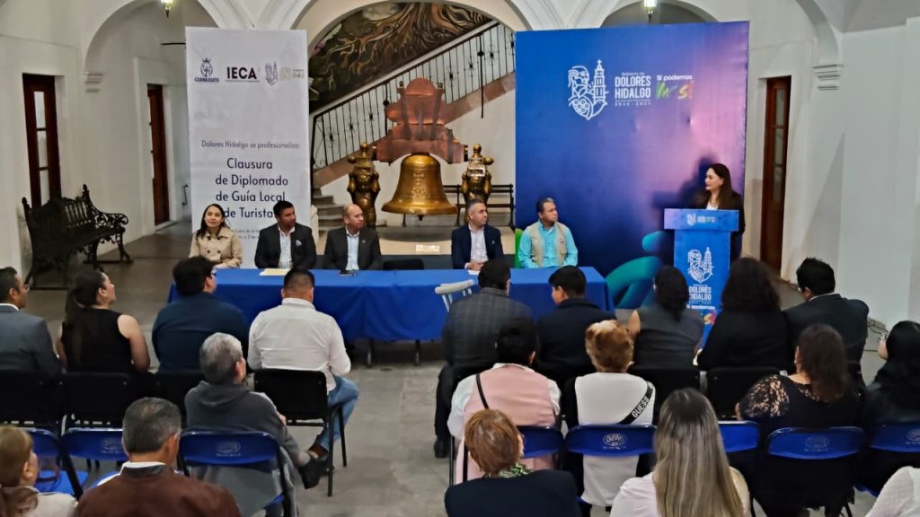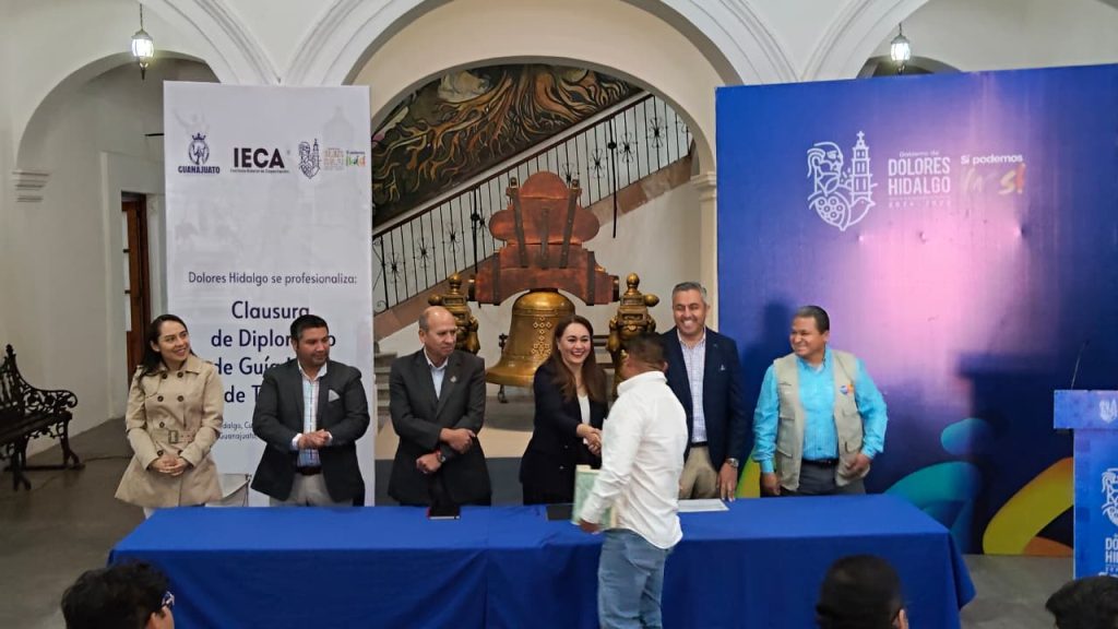 Dolores Hidalgo Cuna de la Independencia Nacional, Guanajuato a 04 de marzo de 2026. Con el objetivo de fortalecer la calidad de los servicios turísticos y generar mayores oportunidades de desarrollo económico para la población, el Instituto Estatal de Capacitación (IECA) en conjunto con el municipio de Dolores Hidalgo Cuna de la Independencia Nacional, llevó a cabo la clausura del Diplomado de Guía de Turistas Local, programa que contribuye a la formación de especialistas preparados para atender al turismo nacional e internacional.