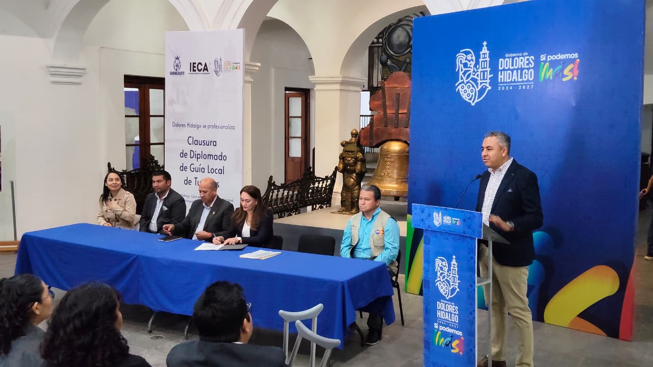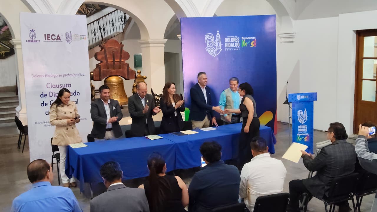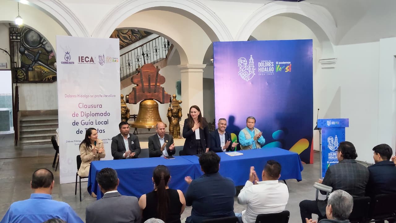 Dolores Hidalgo Cuna de la Independencia Nacional, Guanajuato a 04 de marzo de 2026. Con el objetivo de fortalecer la calidad de los servicios turísticos y generar mayores oportunidades de desarrollo económico para la población, el Instituto Estatal de Capacitación (IECA) en conjunto con el municipio de Dolores Hidalgo Cuna de la Independencia Nacional, llevó a cabo la clausura del Diplomado de Guía de Turistas Local, programa que contribuye a la formación de especialistas preparados para atender al turismo nacional e internacional.