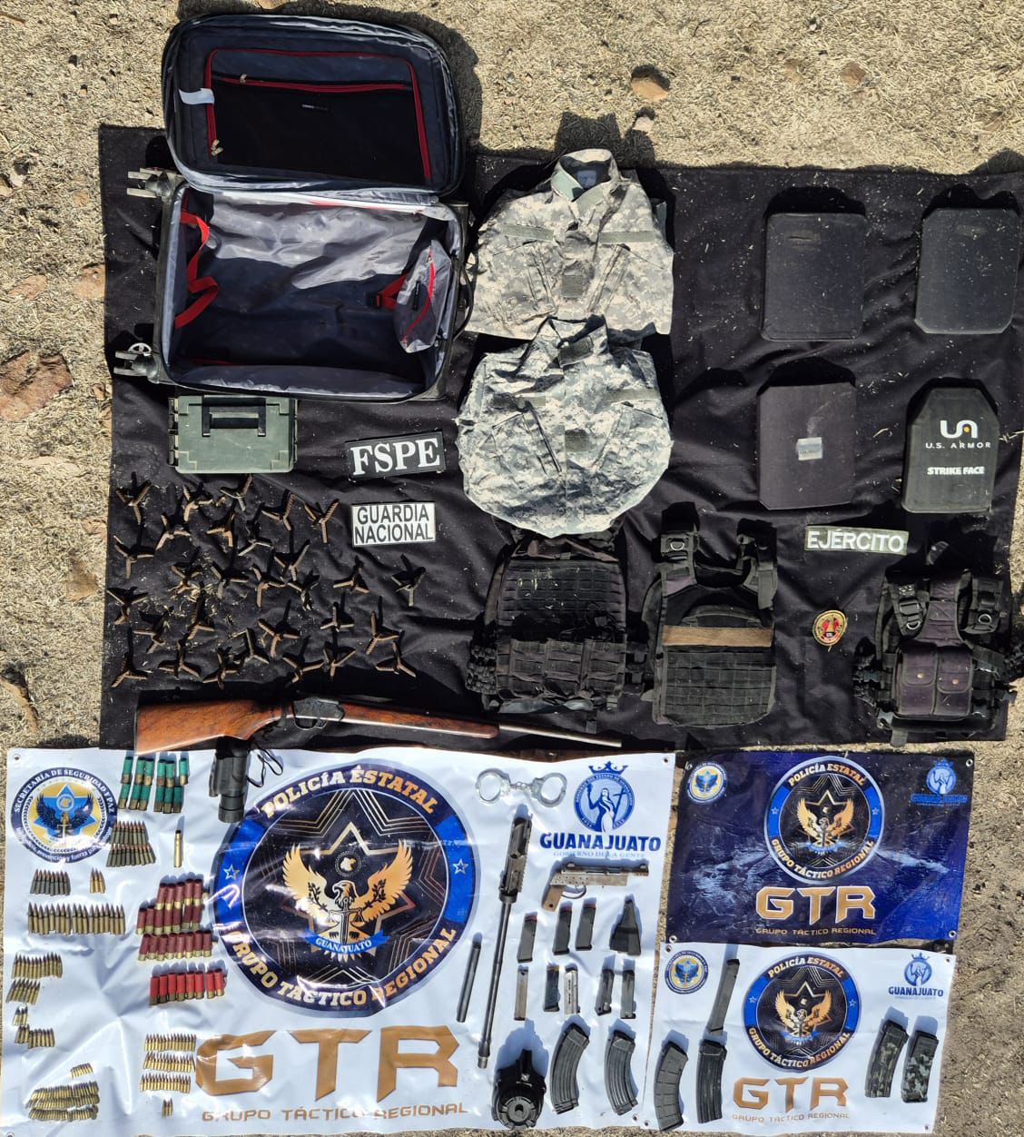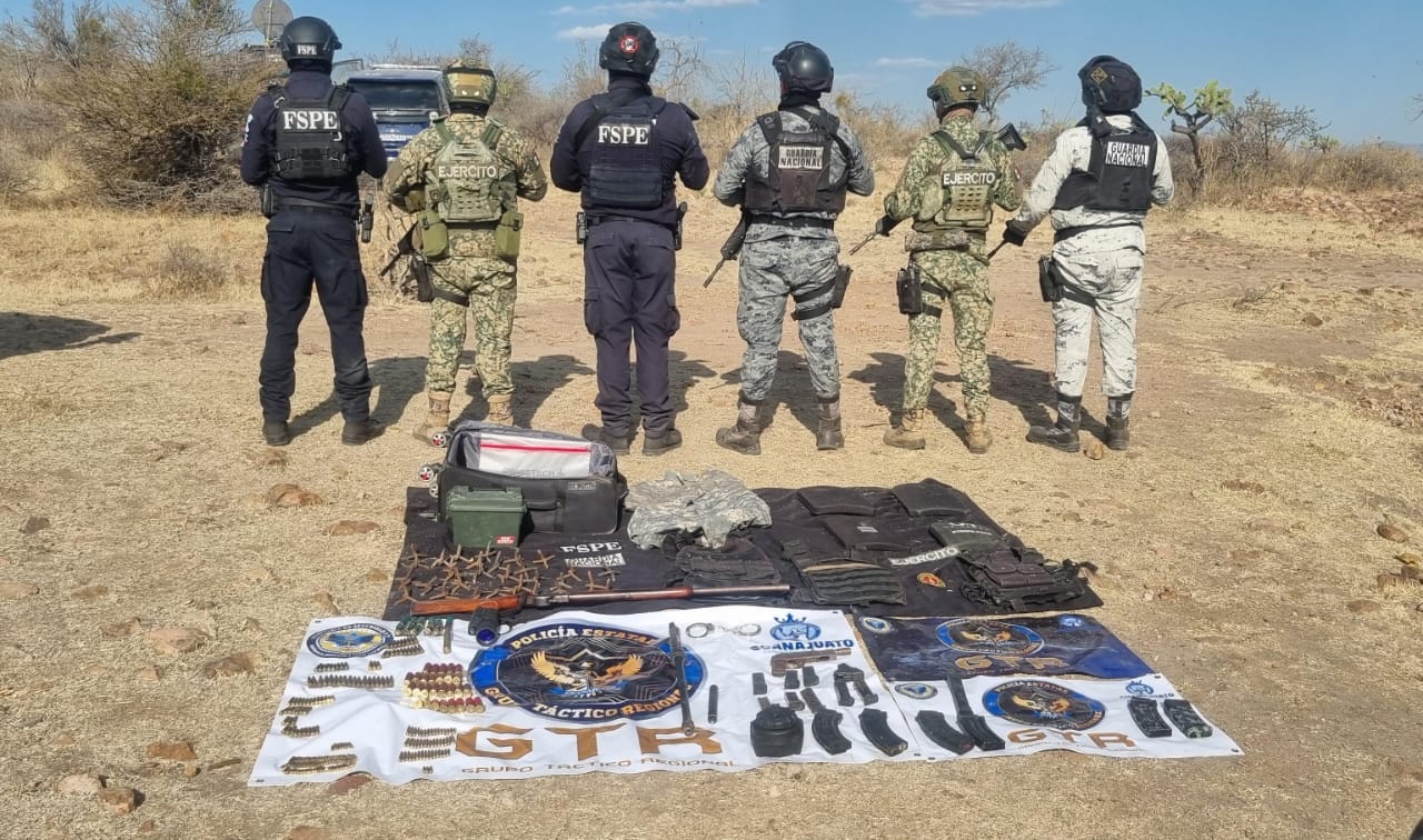 Juventino Rosas, Gto., a 11 de marzo de 2026.– La Secretaría de Seguridad y Paz, a través del Grupo Táctico Regional de las Fuerzas de Seguridad Pública del Estado (FSPE) y en coordinación con el Ejército Mexicano y la Guardia Nacional, aseguró armamento, municiones y equipo táctico durante un operativo.