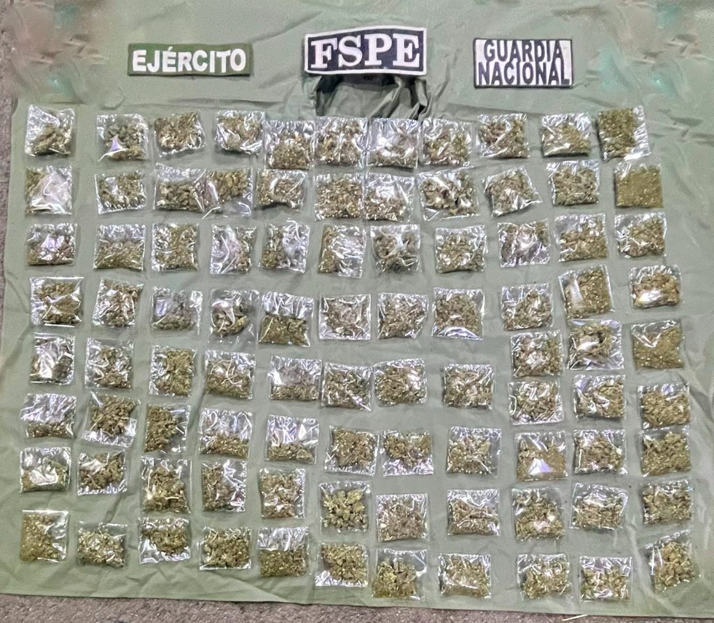 dólares estadounidenses. Al inspeccionar la mochila que había arrojado se localizaron 90 bolsas con hierba verde y seca con características de la marihuana, equivalente a cerca de 979 dosis.