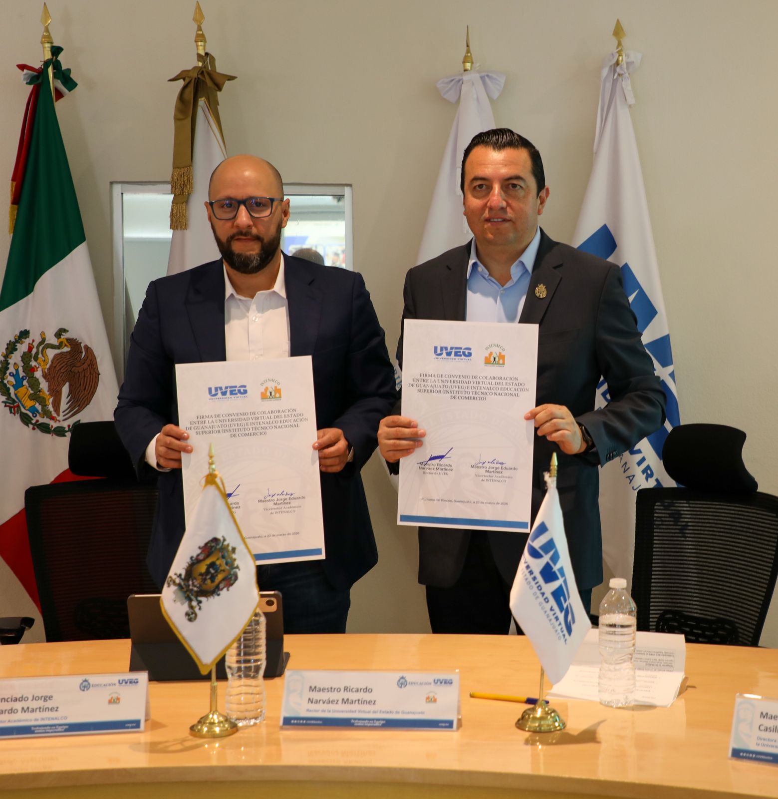 Purísima del Rincón, Guanajuato, 24 de marzo de 2026. La Universidad Virtual del Estado de Guanajuato (UVEG) continúa ampliando sus fronteras y posicionando el talento de su comunidad educativa a nivel internacional, tras la firma de un convenio de colaboración académica con el Instituto Técnico Nacional de Comercio (INTENALCO), con sede en Cali, Colombia.