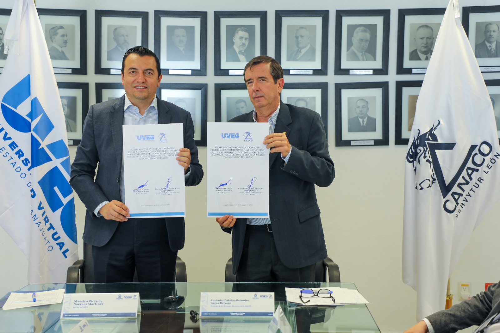 León, Guanajuato; 25 de marzo de 2026. La Universidad Virtual del Estado de Guanajuato (UVEG) y la Cámara Nacional de Comercio, Servicios y Turismo de León (CANACO SERVyTur) consolidaron una alianza estratégica que fortalece la vinculación entre el sector educativo y empresarial, con el objetivo de contribuir al desarrollo del talento, la capacitación y la innovación en la región.
