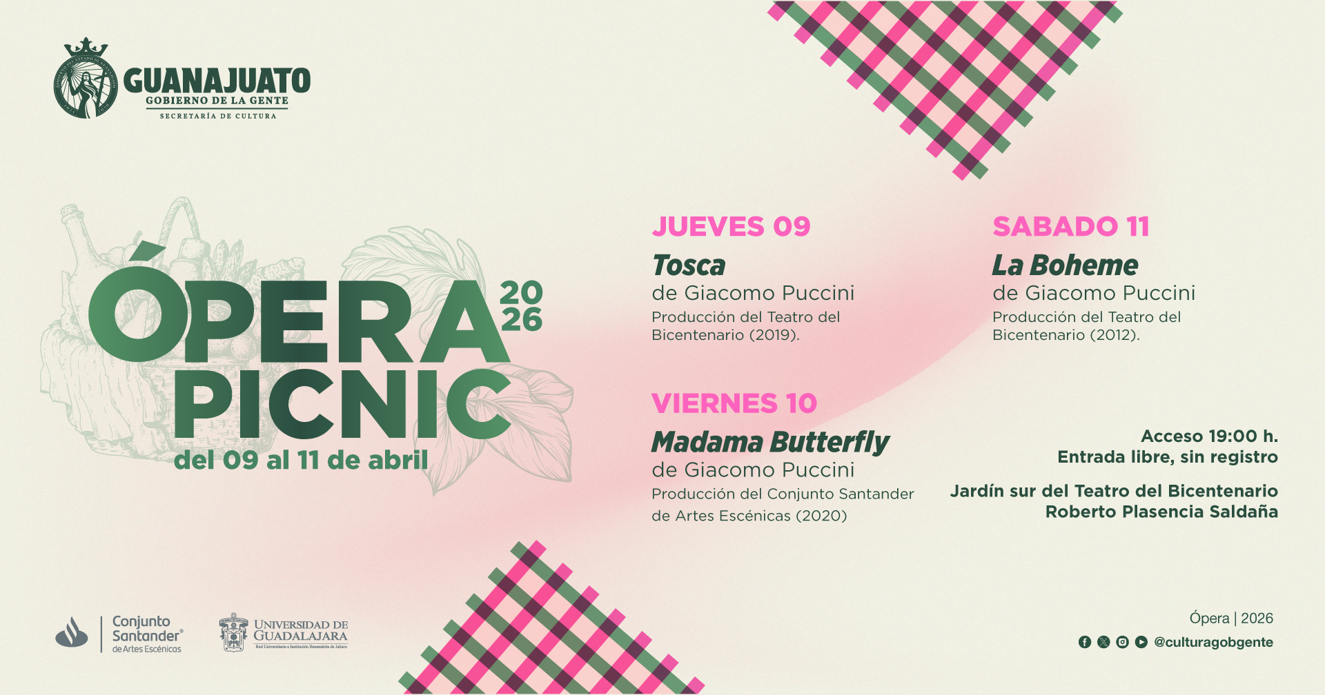 En León, el Teatro del Bicentenario Roberto Plasencia Saldaña será sede de “Ópera Picnic”, una experiencia que invita a disfrutar al aire libre de tres grandes títulos de Giacomo Puccini: Tosca, Madama Butterfly y La Bohème, en formato de proyección, creando un ambiente accesible, relajado y familiar bajo las estrellas.