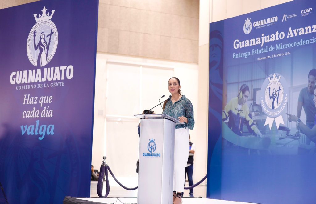 Irapuato, Gto. 08 de abril de 2026.- La Gobernadora de la Gente, Libia Dennise García Muñoz Ledo, encabezó la entrega Estatal de Microcredenciales, certificaciones digitales que validan competencias específicas enfocadas en habilidades que permiten a una persona trabajar mejor en equipo, tomar decisiones, adaptarse al cambio o liderar procesos.
