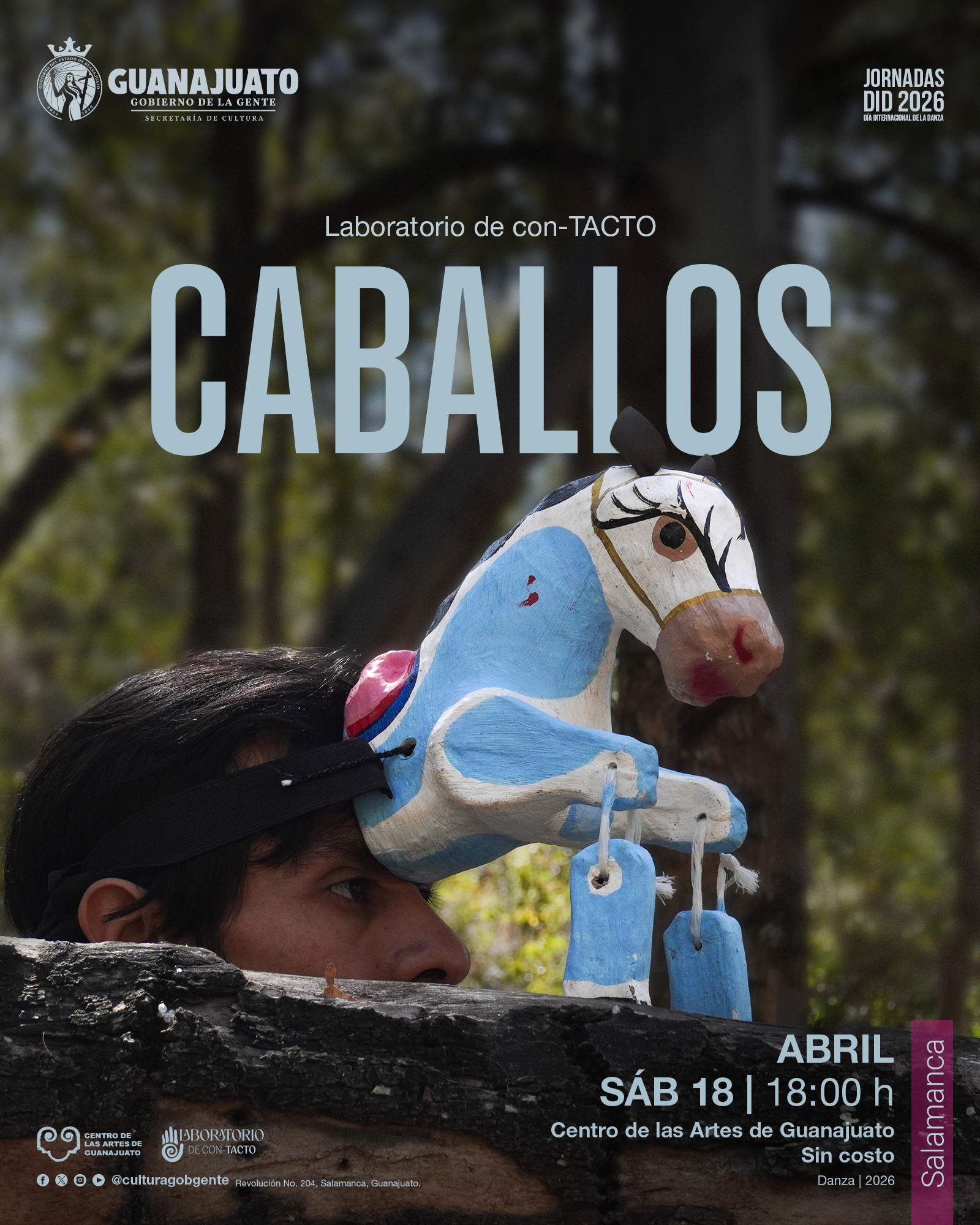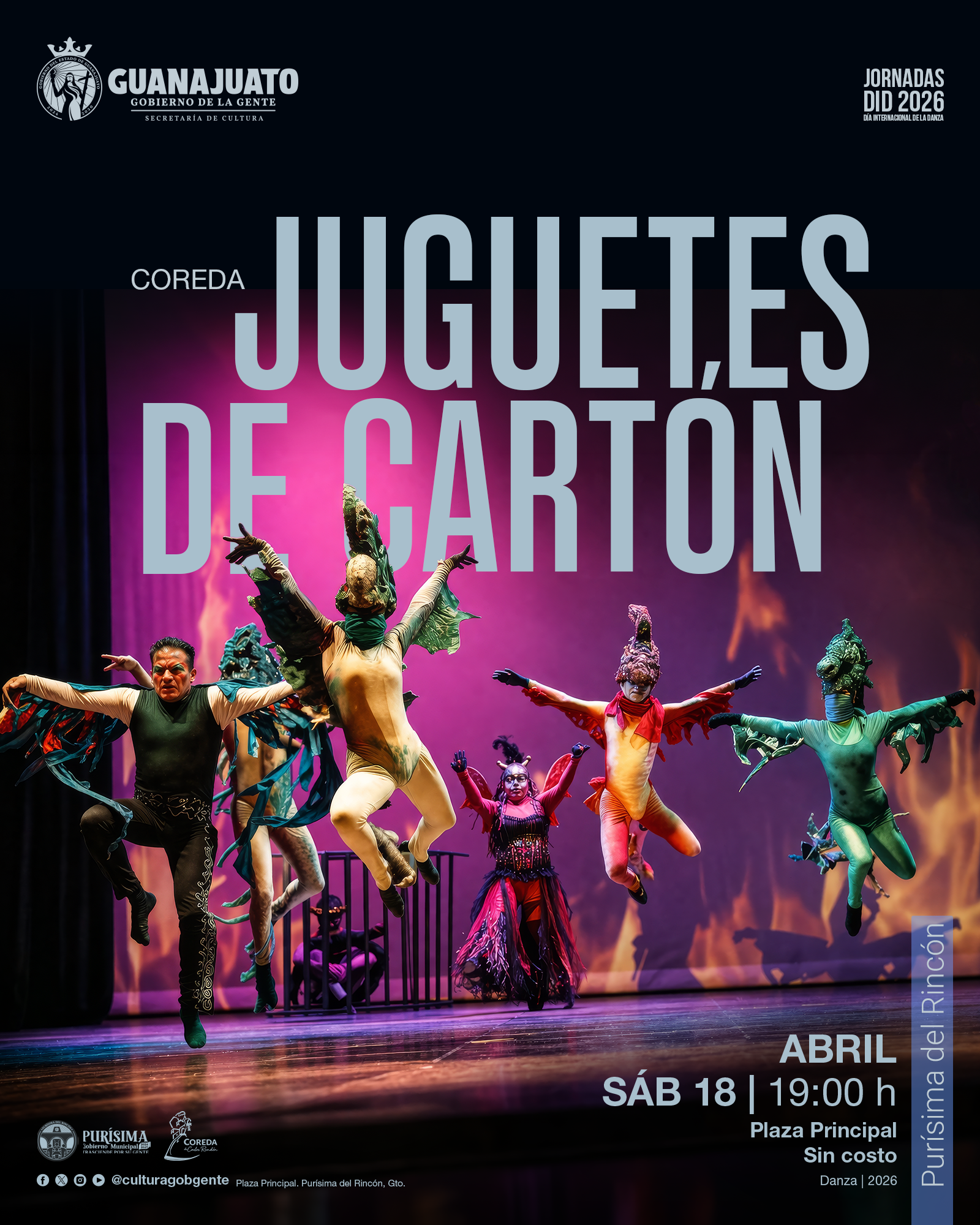 El 18 de abril, la actividad inicia en el Centro de las Artes de Guanajuato en Salamanca con la presentación de Caballos, del Laboratorio de Con-TACTO, una obra que explora las distintas formas del afecto entre hombres y reflexiona sobre las masculinidades. Ese mismo día, en León, el Jardín de las Jacarandas del Forum Cultural albergará la presentación de danza africana del Colectivo Alarake, una celebración de la tradición, el ritmo y la conexión comunitaria a través de música en vivo; mientras que en el Teatro Estudio del Teatro del Bicentenario se presentará Cihuameh, del Colectivo Arte Escena, propuesta contemporánea que dialoga con las raíces indígenas y la identidad. En Purísima del Rincón, la Compañía Regional de Danza COREDA presentará Juguetes de Cartón, obra inspirada en la tradición de la cartonería guanajuatense que integra danza folclórica, clásica y contemporánea.