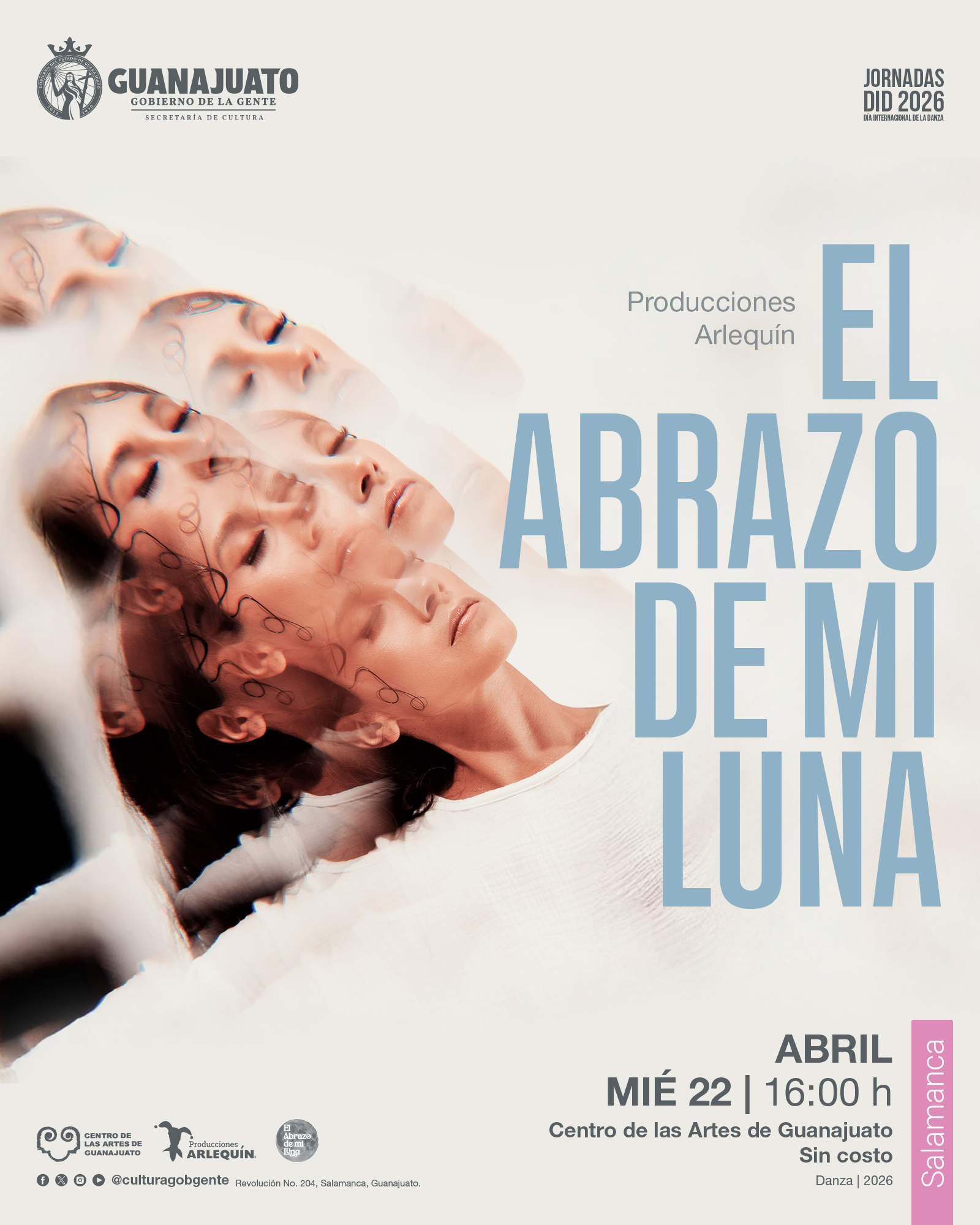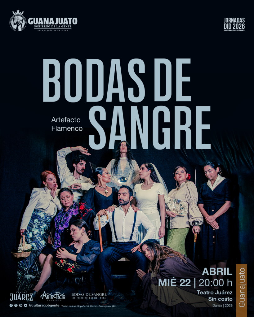 Para el 22 de abril, en Salamanca, el Centro de las Artes de Guanajuato será sede de El abrazo de mi luna, de Producciones Arlequín, una pieza íntima que reflexiona sobre el ciclar femenino; mientras que en Guanajuato capital, el Teatro Juárez recibirá Bodas de Sangre, de Artefacto Flamenco, una reinterpretación de la obra de Federico García Lorca desde la potencia expresiva del flamenco.