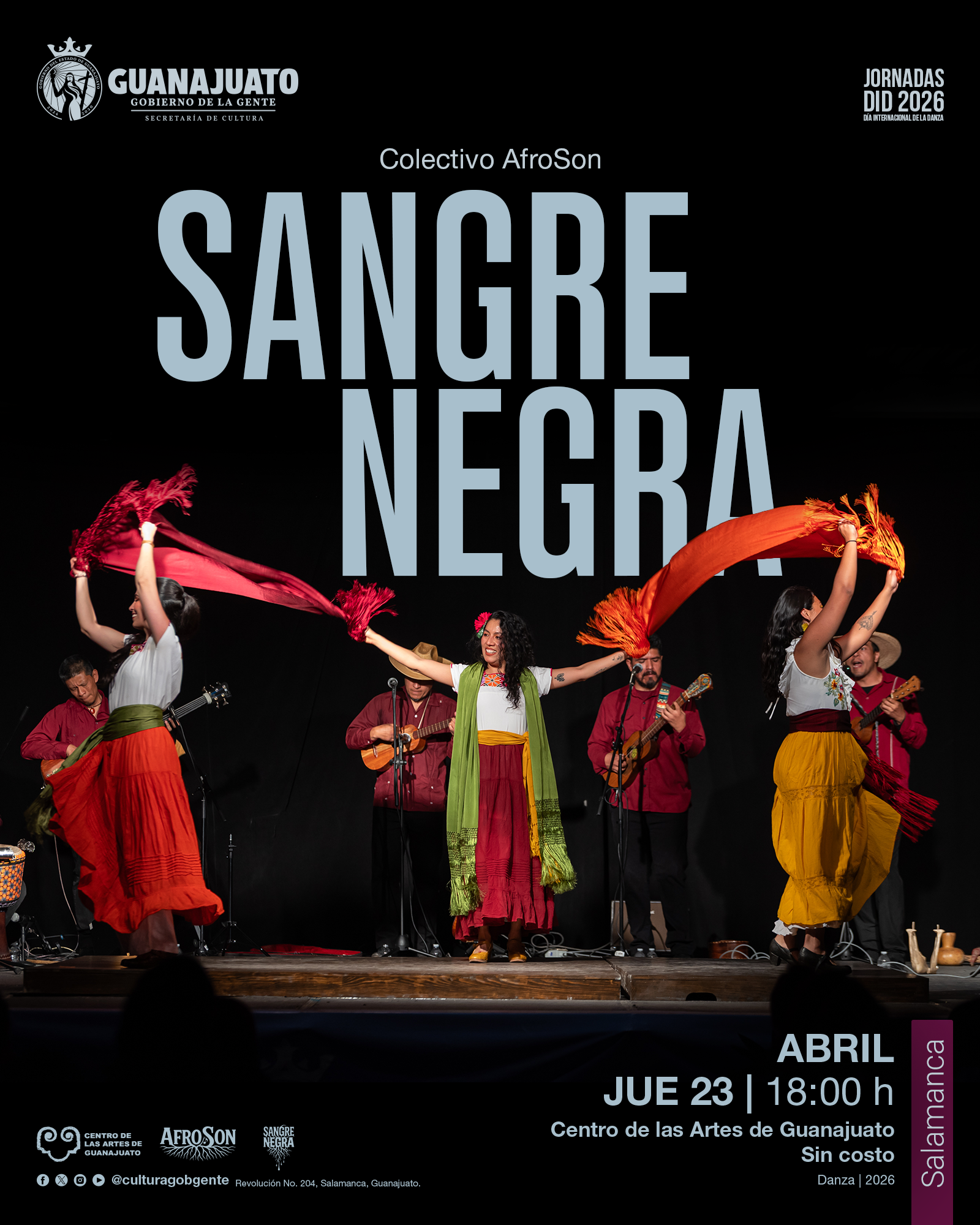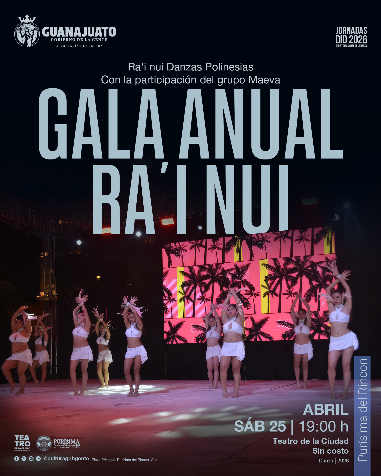 El 25 de abril, la programación continúa en León con Time Lapse, de Alter Ego Danza, una propuesta contemporánea sobre la carga emocional y la libertad individual; en Salamanca se presentará Sangre Negra, del Colectivo AfroSon, espectáculo multidisciplinario que vincula el son mexicano con ritmos africanos y caribeños; y en Purísima del Rincón tendrá lugar la Gala Anual Ra’i nui, dedicada a las danzas polinesias y su riqueza cultural.