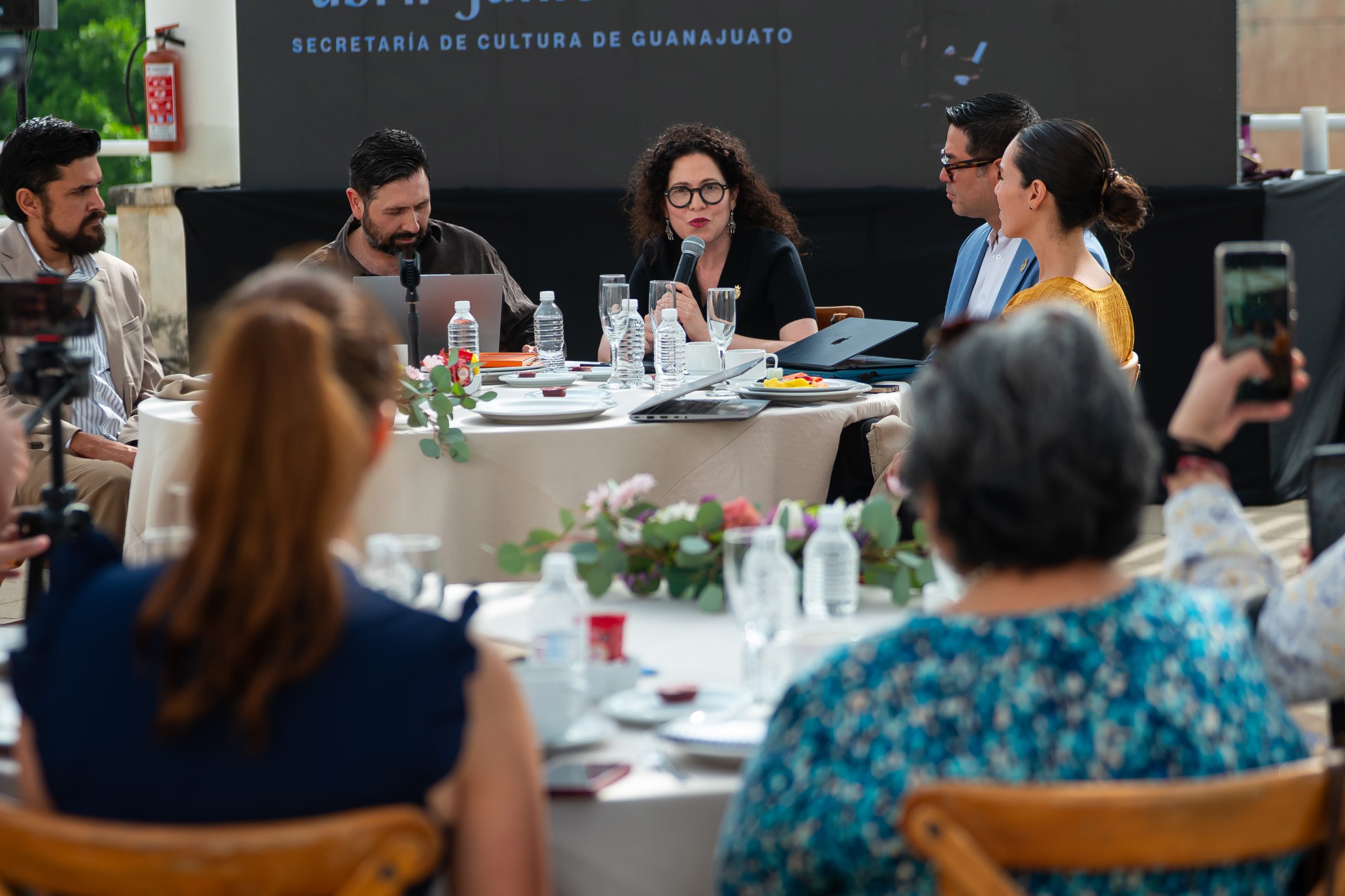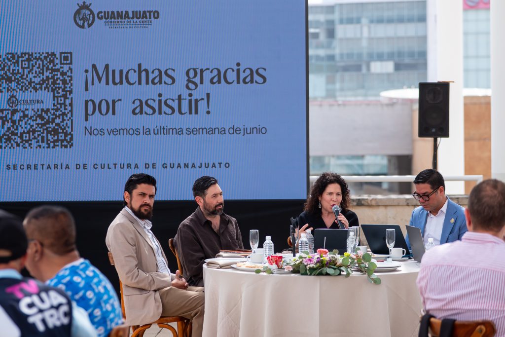 En el marco de un desayuno informativo con medios de comunicación, realizado en la terraza de la Biblioteca Central Wigberto Jiménez Moreno del Forum Cultural Guanajuato, la secretaria de Cultura, Lizeth Galván Cortés, encabezó la presentación de resultados y la proyección de actividades para el próximo trimestre. Estuvo acompañada por el subsecretario de Desarrollo y Promoción Artística y Cultural Álvaro Octavio Lara Huerta; el subsecretario de Desarrollo Comunitario y Promoción Patrimonial, Víctor Manuel Pedro Marín Meléndez; así como directores de las distintas áreas de la dependencia.