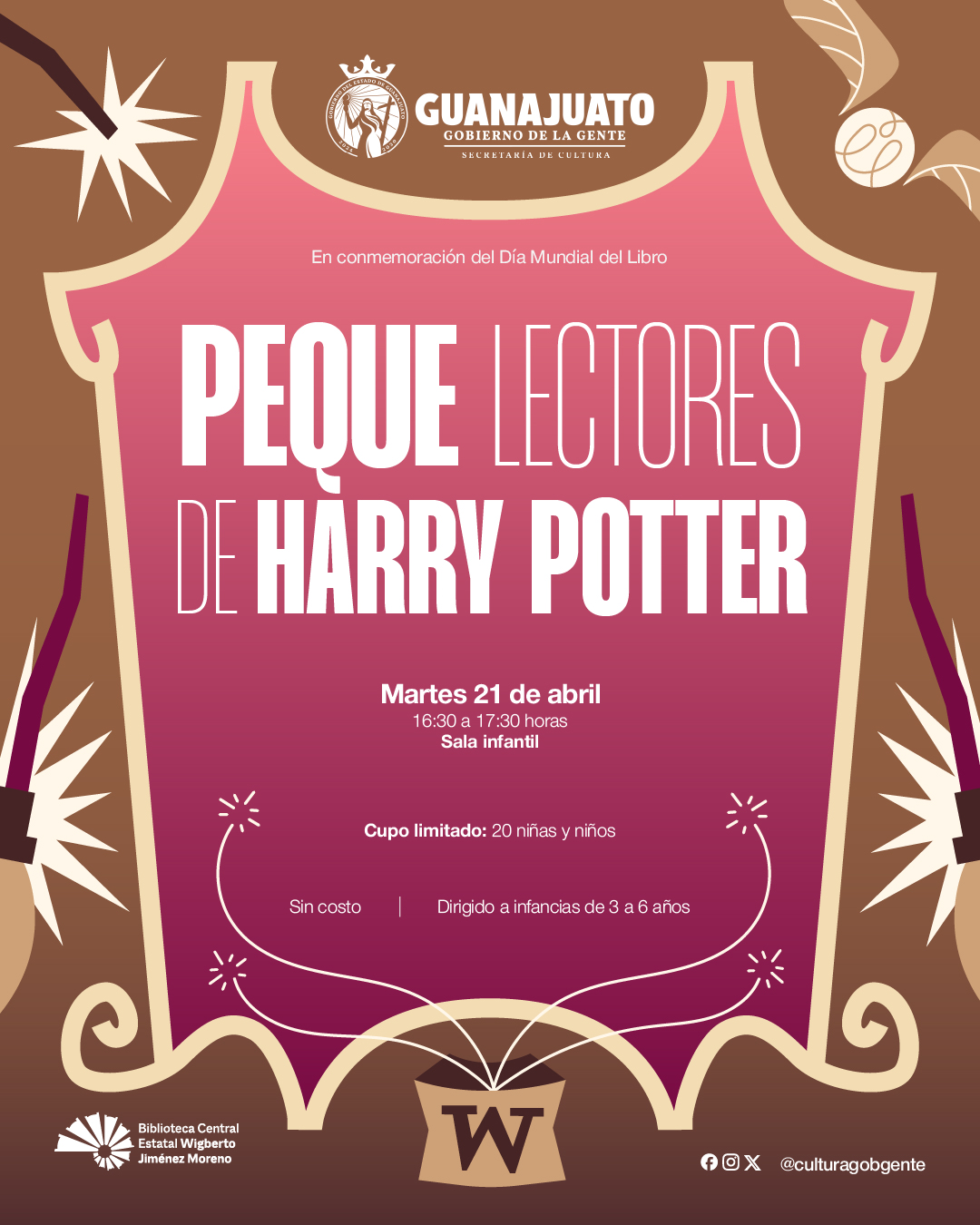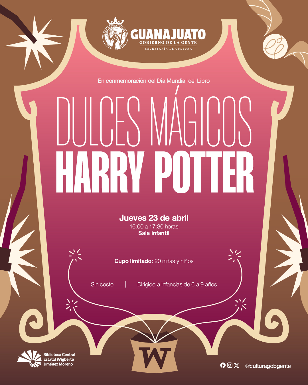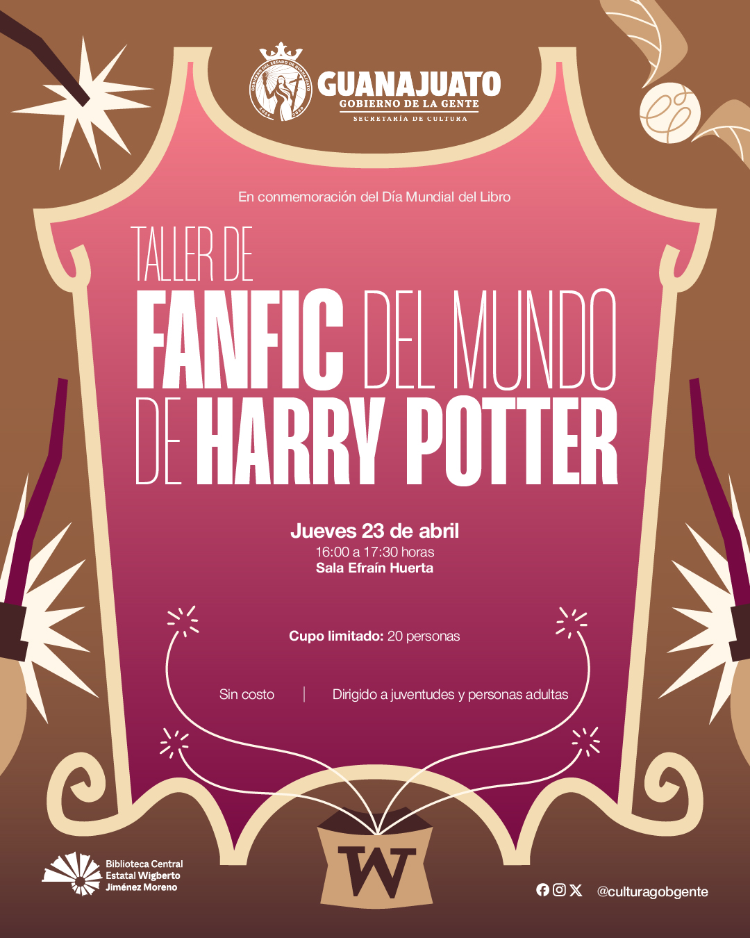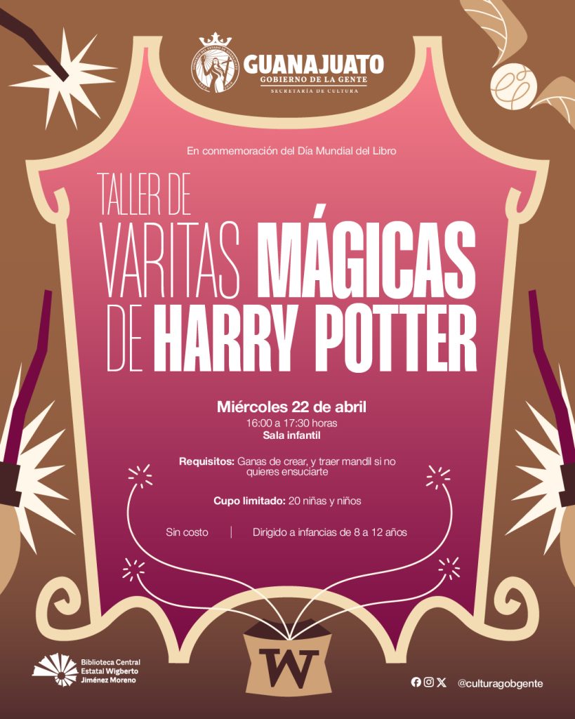 De manera complementaria, la Biblioteca Central Estatal Wigberto Jiménez Moreno, en la ciudad de León, desarrollará un programa especial de actividades presenciales y gratuitas en torno a la lectura, dirigido a distintos públicos. A partir del martes 21 de abril, las infancias podrán participar en talleres temáticos inspirados en el universo de Harry Potter, donde conocerán sus historias y vivirán experiencias lúdicas llenas de imaginación. El miércoles 22 de abril continuará la programación con un espacio creativo para la elaboración de varitas mágicas, mientras que el jueves 23 se llevarán a cabo actividades como la creación de dulces mágicos en papiroflexia, así como un taller de escritura de fan fiction dirigido a juventudes y personas adultas, que invita a reinventar los universos narrativos de esta popular saga.