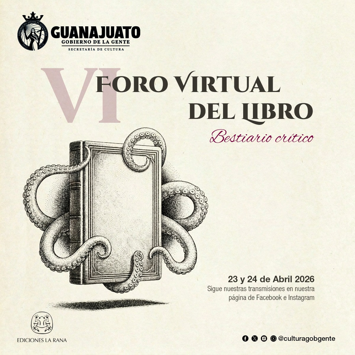 Por otro lado, Ediciones La Rana invita al VI Foro Virtual del Libro, Bestiario crítico, los días jueves 23 y viernes 24 de abril, a través de transmisiones de su página de Facebook y la cuenta de Instagram.