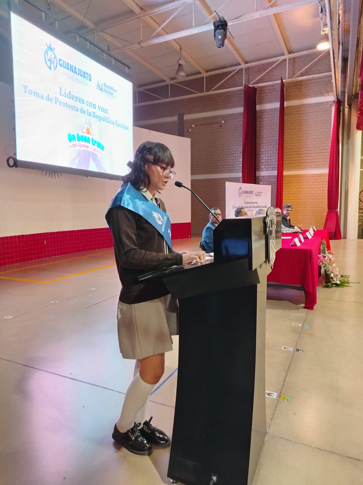 En representación de las y los estudiantes que rindieron protesta, Karol Mariana Becerra Rodríguez, Presidenta de la República Escolar de la Escuela Secundaria General No. 59, señaló que este momento representa un reconocimiento al esfuerzo, ideas y entusiasmo de quienes participan activamente en sus escuelas.
