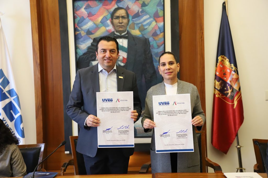 Irapuato, Guanajuato a 8 de enero de 2026. Con la finalidad de acercar la educación a más personas y fortalecer el desarrollo de la comunidad, la Universidad Virtual del Estado de Guanajuato (UVEG) y el Municipio de Irapuato firmaron un convenio de colaboración que permitirá ampliar el acceso a programas educativos, educación continua y servicios de formación, así como fortalecer la operación de los Centros de Acceso Educativo (CAE) y los Telebachilleratos de la UVEG en el municipio.