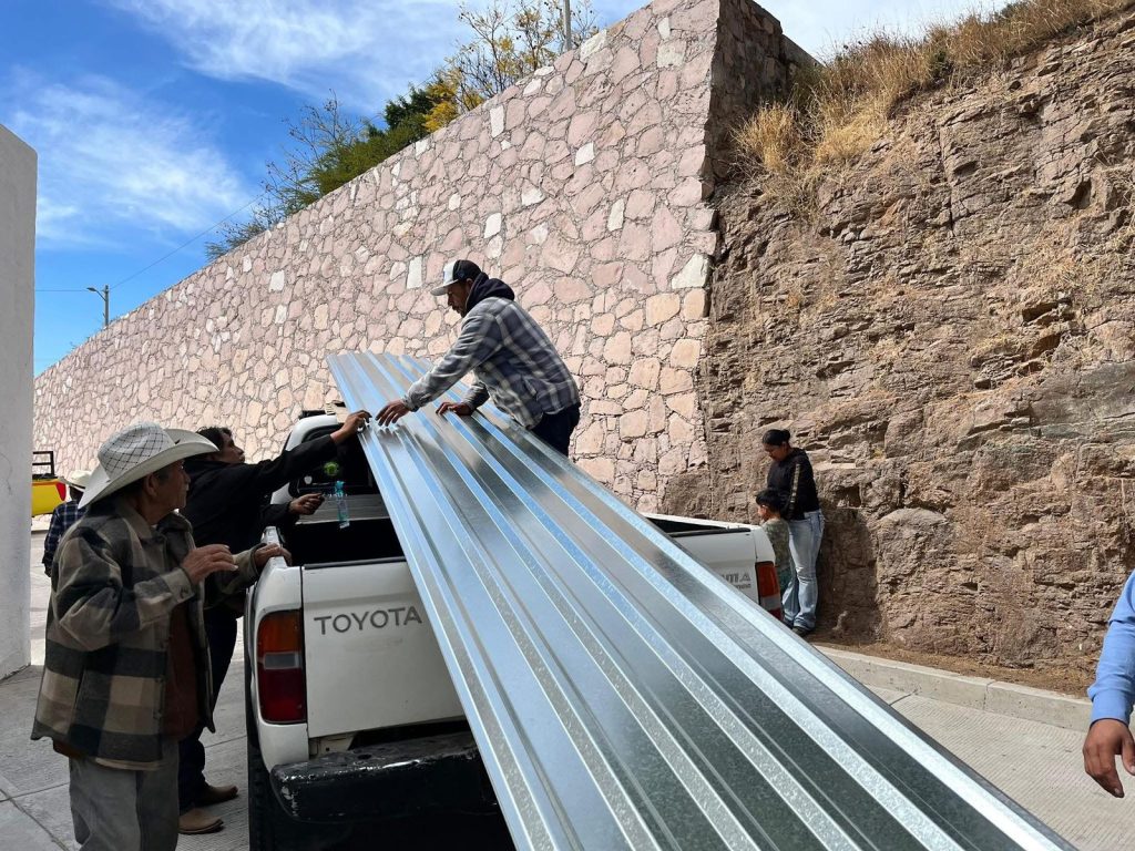 Se hizo entrega de 156 láminas y 104 montenes en beneficio de 26 familias de las localidades de El Tablón, Agua Buena, El Copudo, Corral Falso, El Chapín Paredes, Ortega, San José del Chillar y Santa Cruz, como parte del Programa Migrantes Construyendo Comunidades, que impulsa acciones sociales.