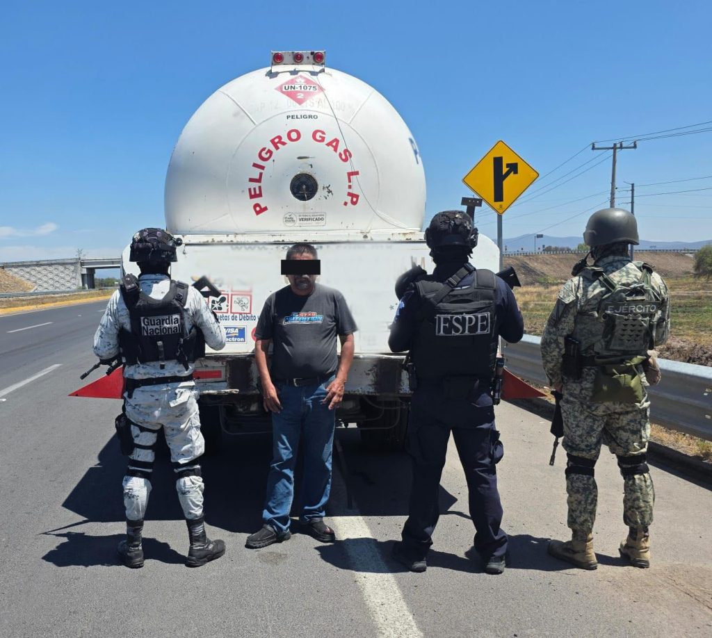 Celaya, Gto., 25 de abril de 2026.- La Secretaría de Seguridad y Paz, a través de las Fuerzas de Seguridad Pública del Estado (FSPE), en coordinación con la Secretaría de la Defensa Nacional (DEFENSA), aseguró un vehículo tipo tanque cargado con gas LP y detuvo al conductor en la comunidad Plancarte.